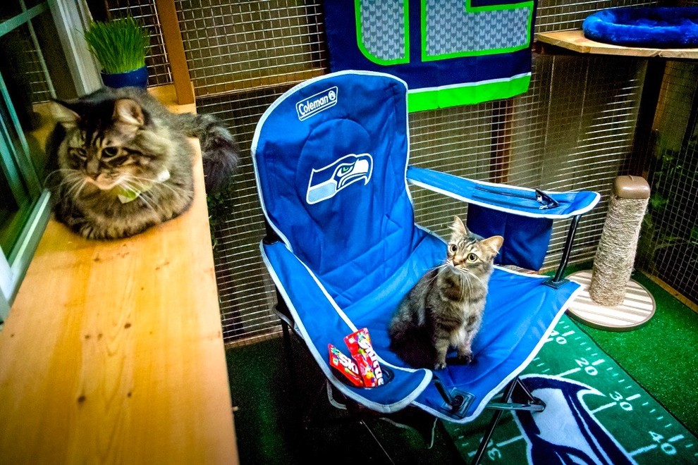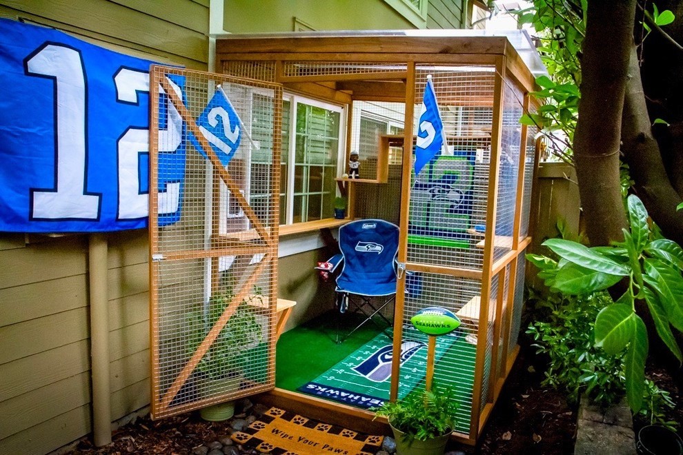 Ready for kickoff. Chomos — a general contractor and feng shui consultant — also builds catios for clients in the Seattle area, using a two-person carpentry crew. She decorated the interior of this Seattle Seahawks football team-themed catio for a diehard fan. She says it “combines a ‘man cave’ and catio for human and feline enjoyment.”