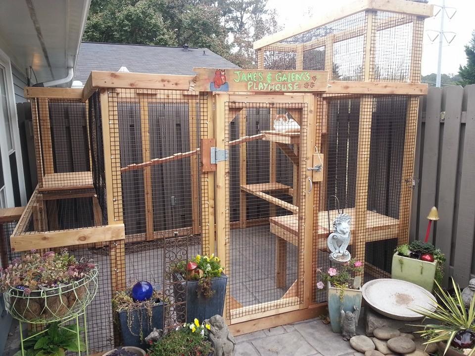 Catio with a view. Building catios is one of the custom carpentry services offered by Zeigler Homestead Services (along with chicken coops and other outdoor habitats). For this catio at a condo in Decatur, Georgia, Joey Zeigler had to get creative with the 80-square-foot space, where he couldn’t build too high above the fence line. He made a small perch so Maine Coon cats James and Galen could look over the fence toward a meadow beyond.