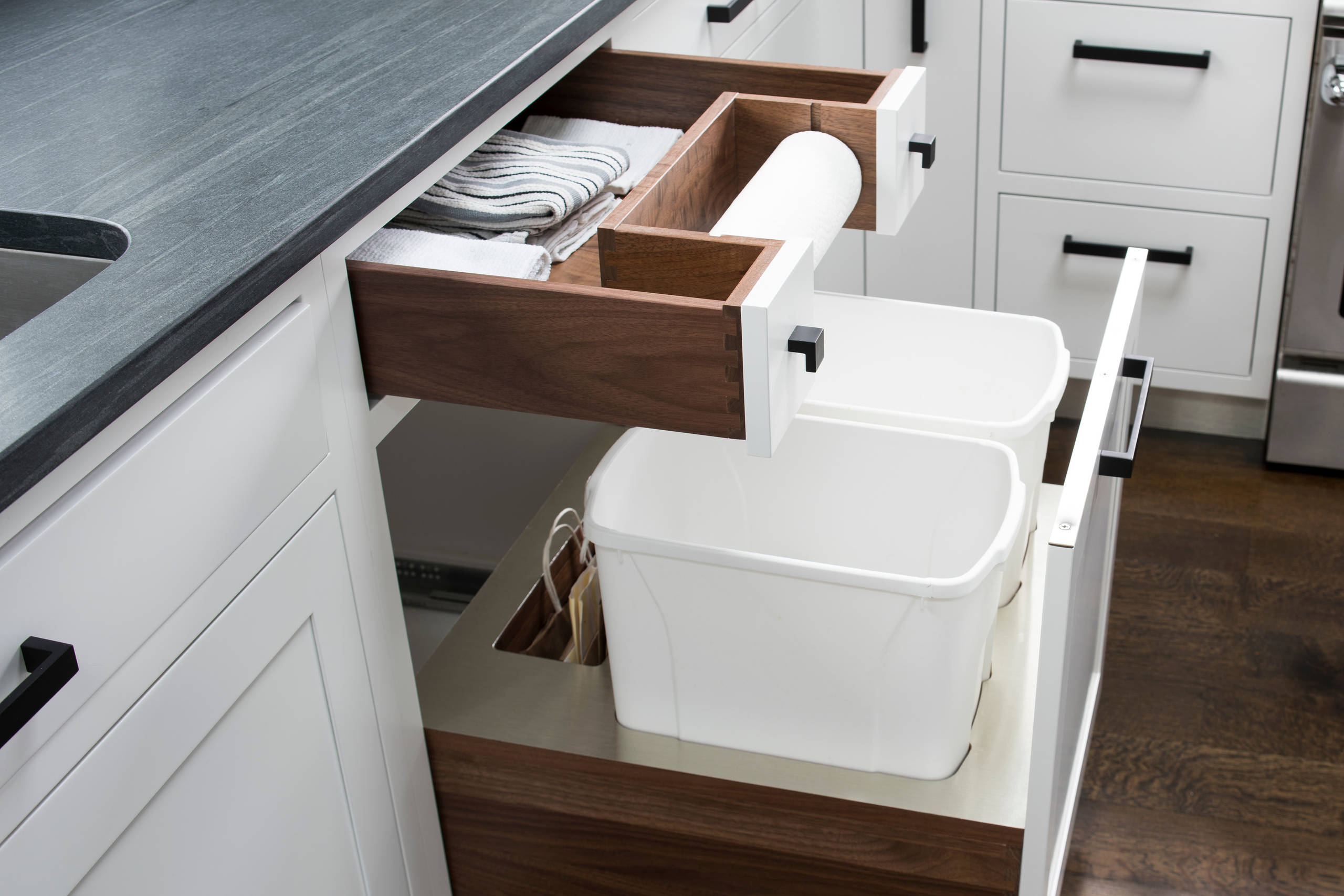 If you want to make sure nobody has an excuse for not changing the bin when it’s full, try a drawer that includes a small storage drawer inside, and you can keep garbage bags and related products right by the bins themselves.