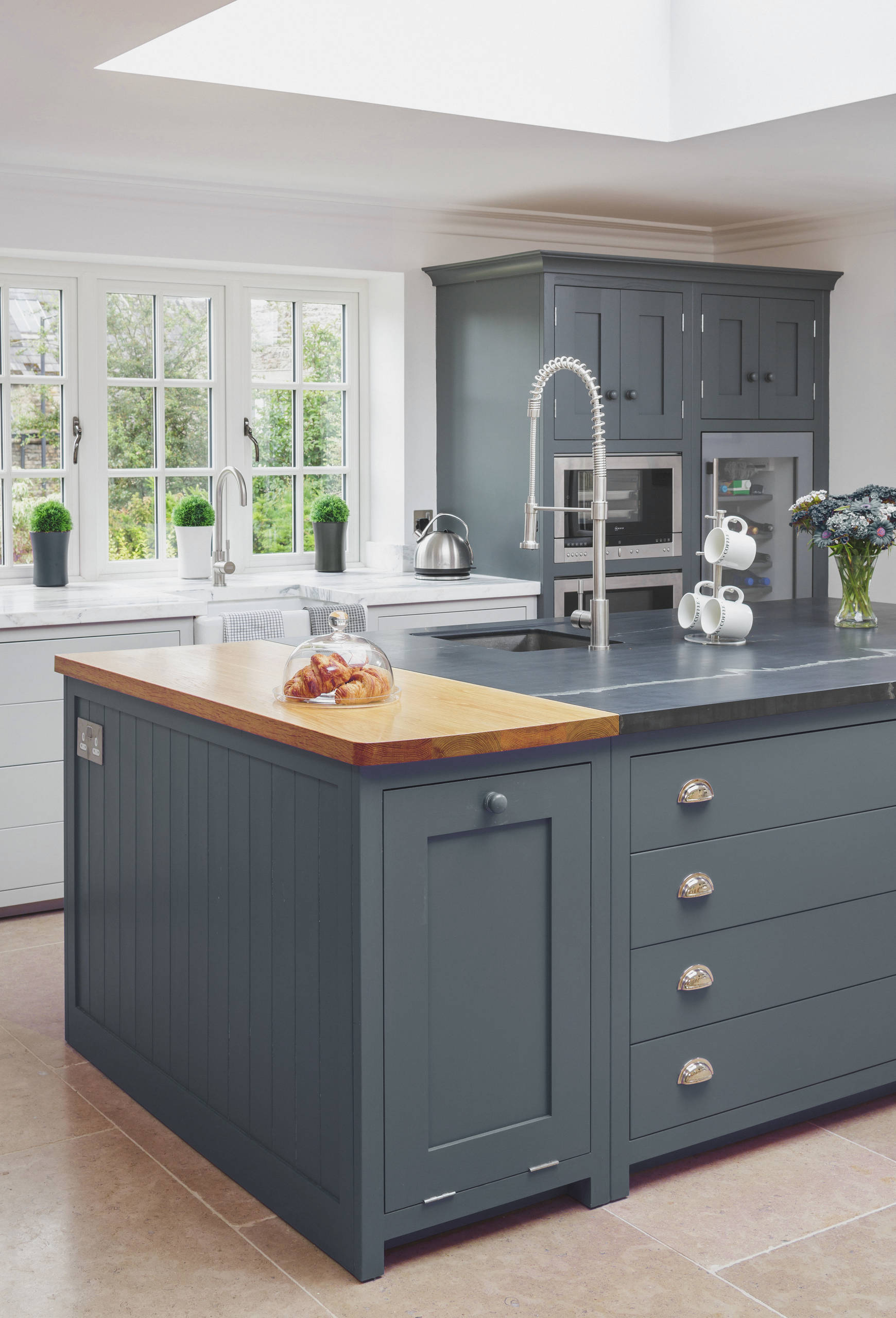 Here’s another smart take on this idea: a pullout chopping block (in place of a typical drawer) positioned above a waste pullout, with a simple hole to allow for trimmings to be swept directly into the bin. A great option for small kitchens, as the whole chopping station can be closed away when not in use, and the main counter can still be used for other things.