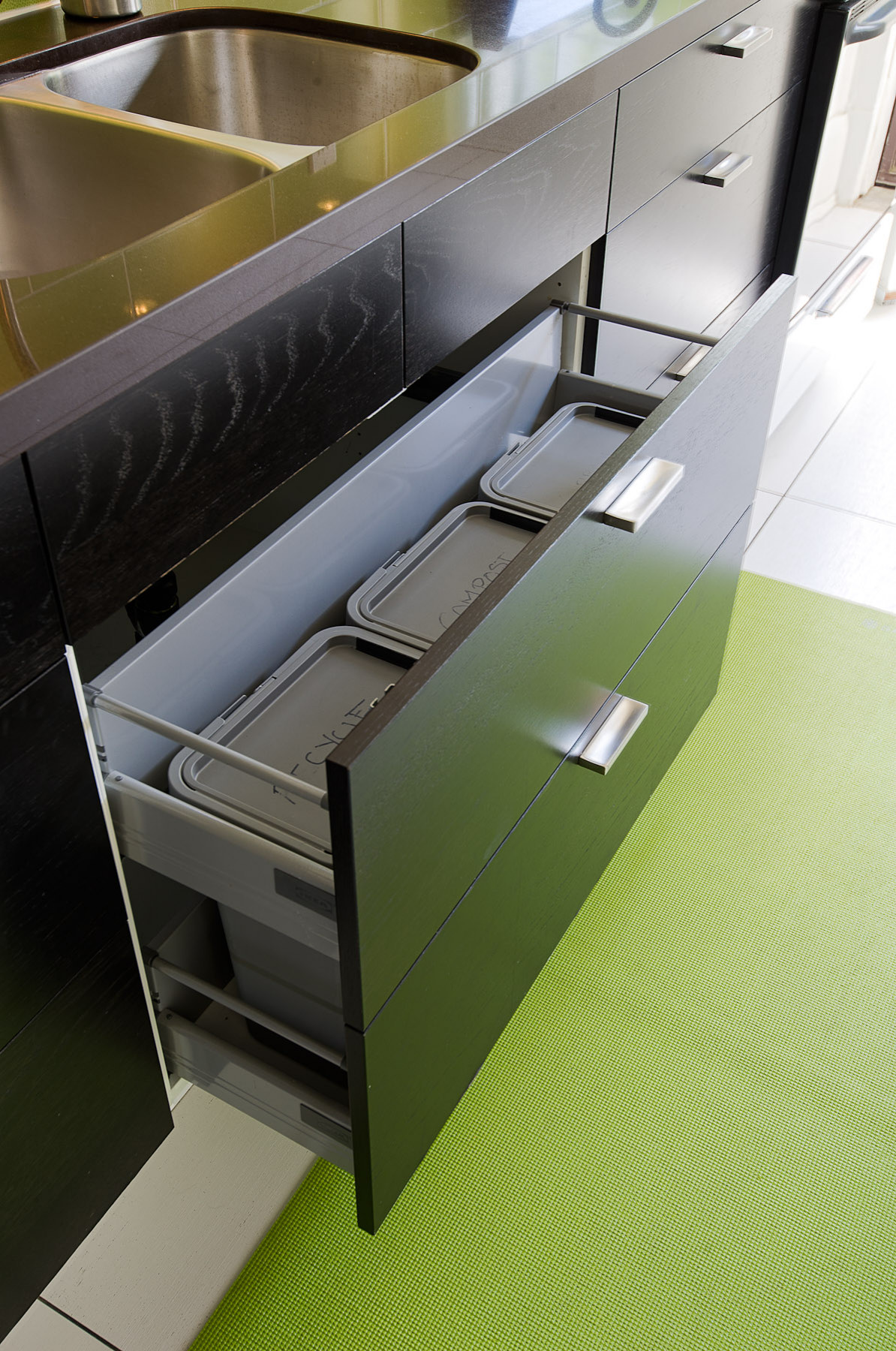Another option is to put different types of waste into their own cabinets with appropriately sized bins so that you only have to open the relevant compartment at any particular time. You can devote more space for plastics and less for compost, or vice versa, depending on your needs.