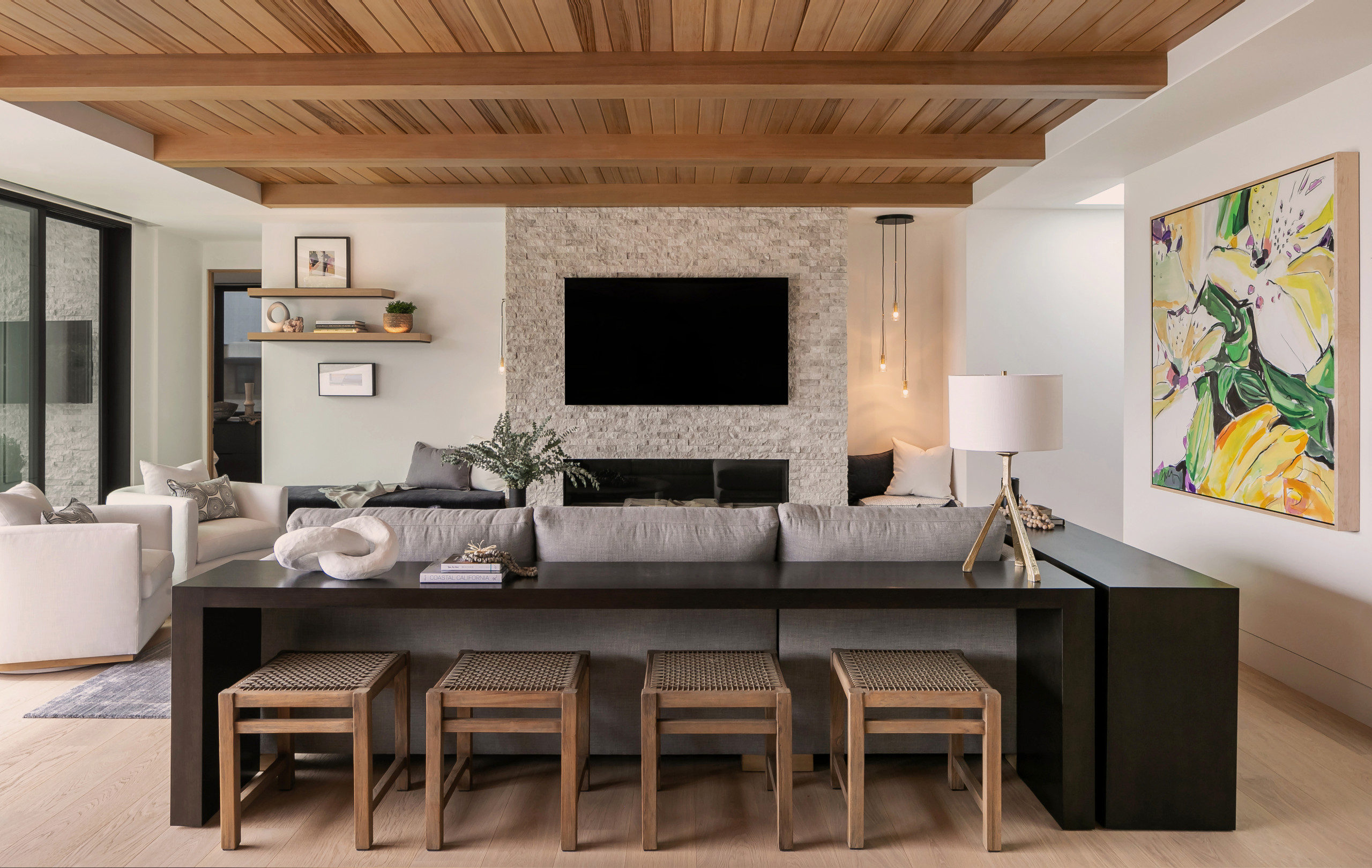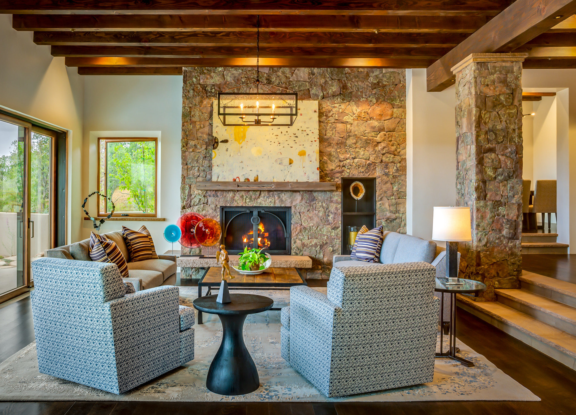 During a sunny day, a living room with abundant natural light flowing through windows can help us feel good. At night, however, we need to replace daylight with a layer of light that will make our space feel more comfortable and relaxing. Light for feeling can come from accent lamps, wall sconces, recessed downlights that highlight stone features, fireplaces and even from table lamps with soft, glowing shades.