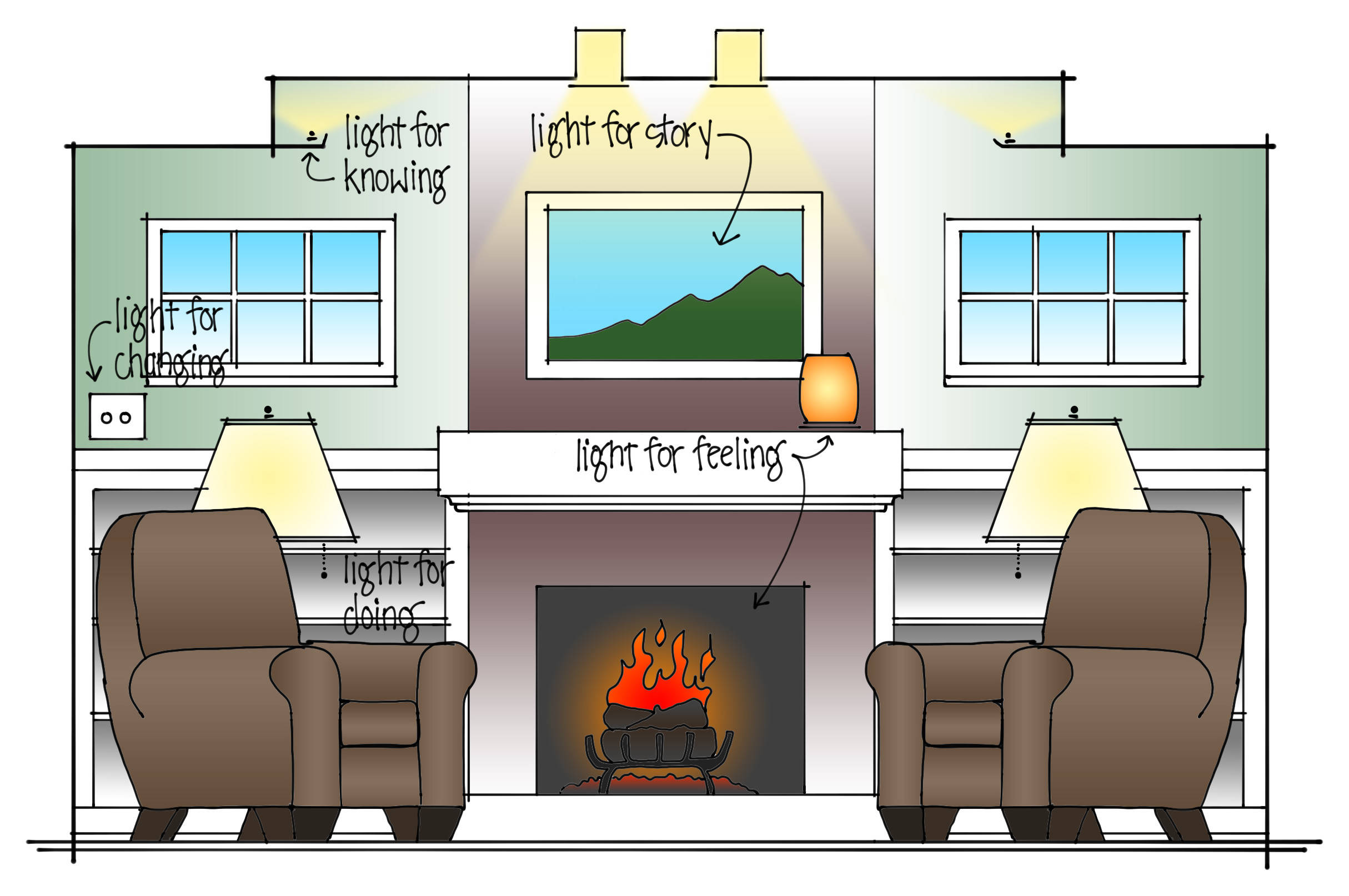 We watch movies, read books, play games, work on our laptops, enjoy a fire and converse with friends in our living room. We keep the lights low for movies, higher for playing games and in between when relaxing with friends. Light for changing helps us adapt to tasks, the location of the sun and aging eyes. This might mean different lamps for different tasks and different times of day, or it can be achieved by adding dimmers that allow you to customize light from moment to moment.