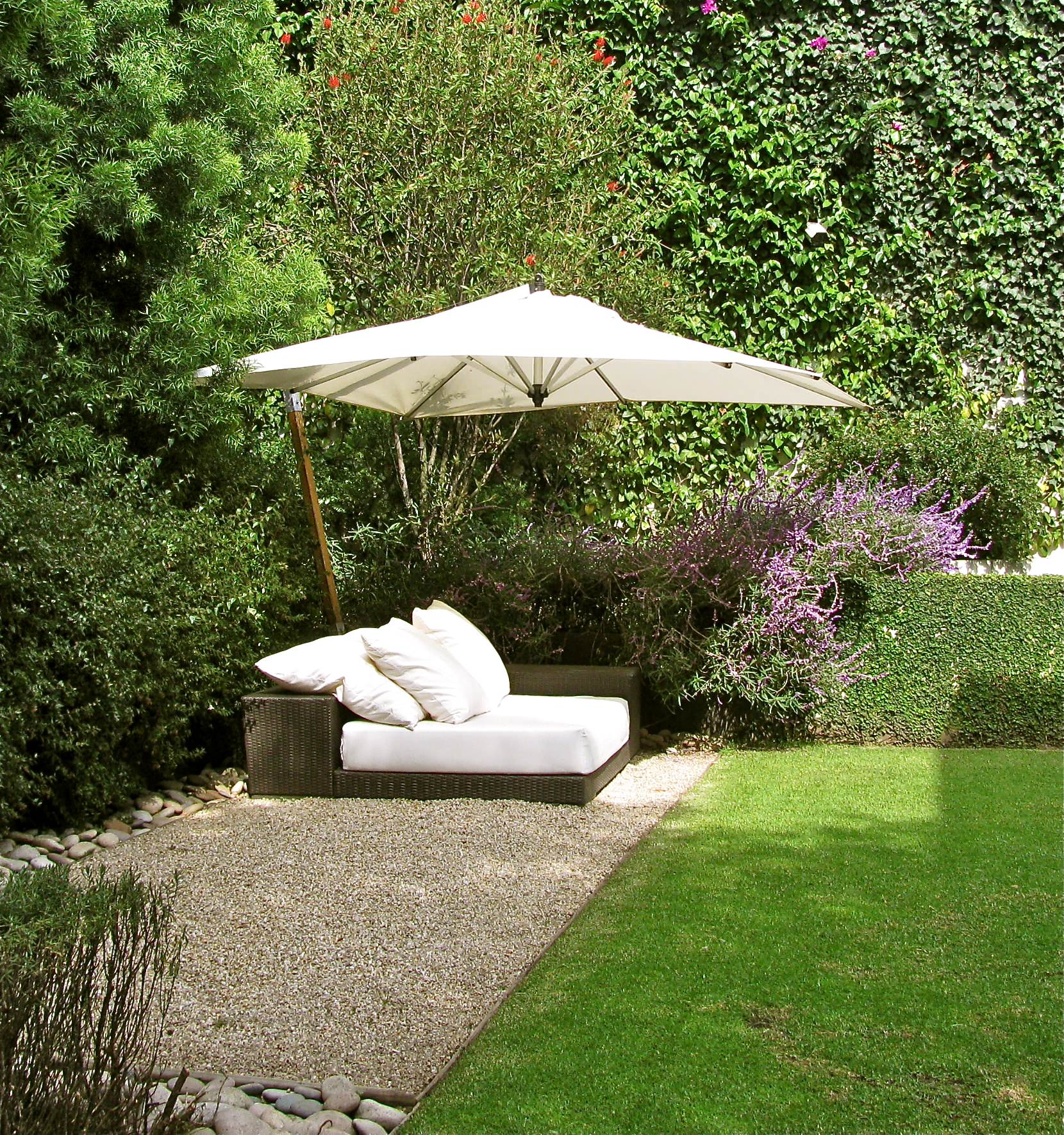 Imagine this sitting area in the middle of an open lawn. “Cozy” is not an adjective that comes to mind. But enclose it within a simple vine trellis and a rich bed of greenery, and it takes on an intimate personality conducive to hours of conversation and relaxation.