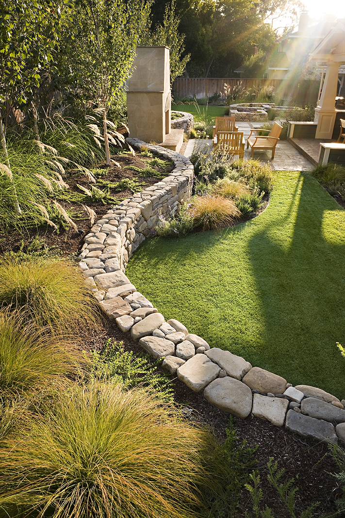 Halt a hillside. Sloping properties come with the challenge of reclaiming enough usable flat space to make outdoor living practical. Since retaining walls tend to be highly visible, and often massive, take care to select materials that harmonize with the other built elements.