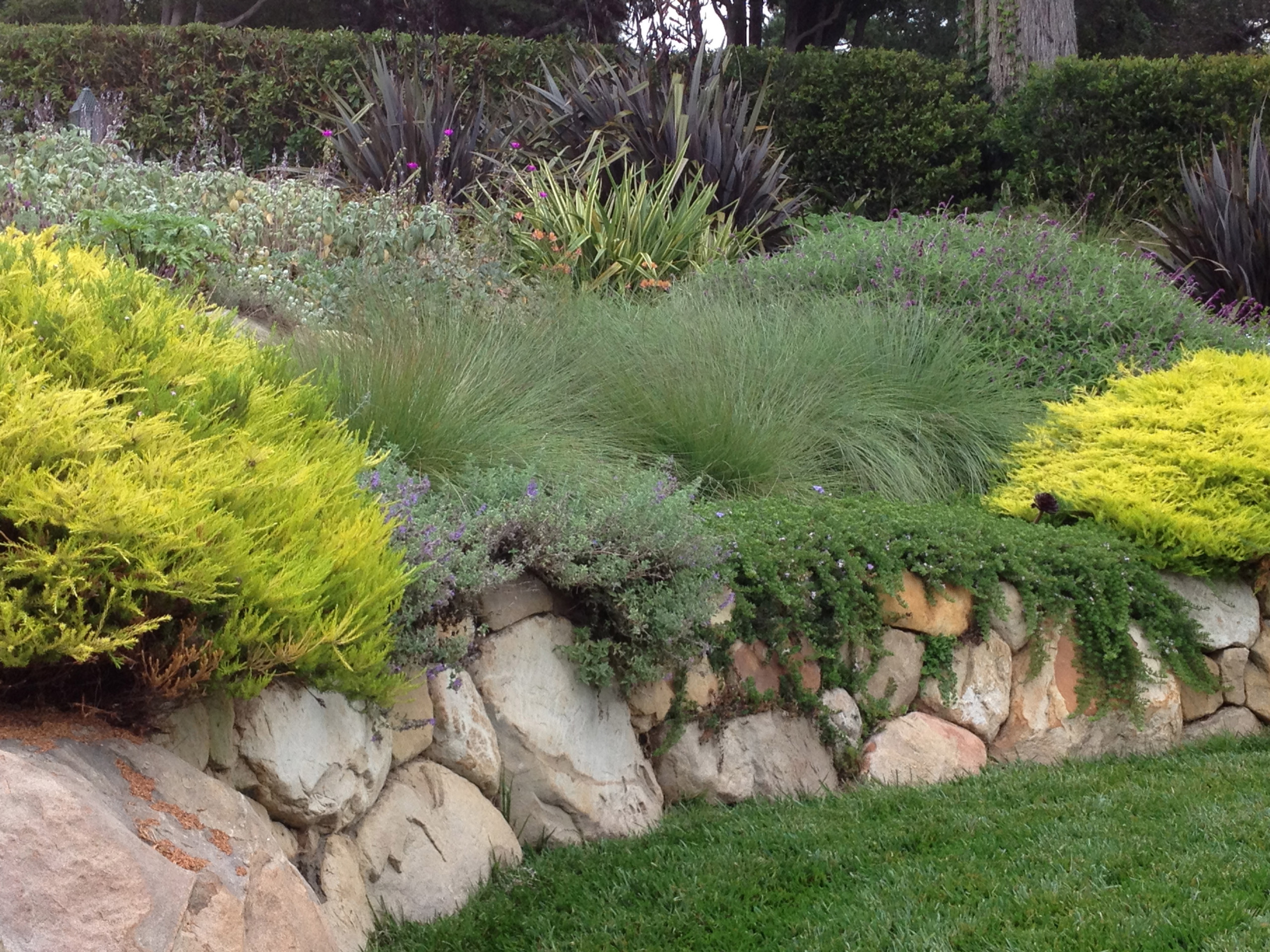 However, slopes can be tough places for plants to grow on; they frequently lack an adequate depth of topsoil for deep root growth. Amend your soil after seeking advice from local garden experts. Provide good drainage behind the wall with porous gravel wrapped in filter fabric, and with weep holes to allow excess water to drain out of the root zone. And research native plants that have adapted to similar growing conditions in their evolution.