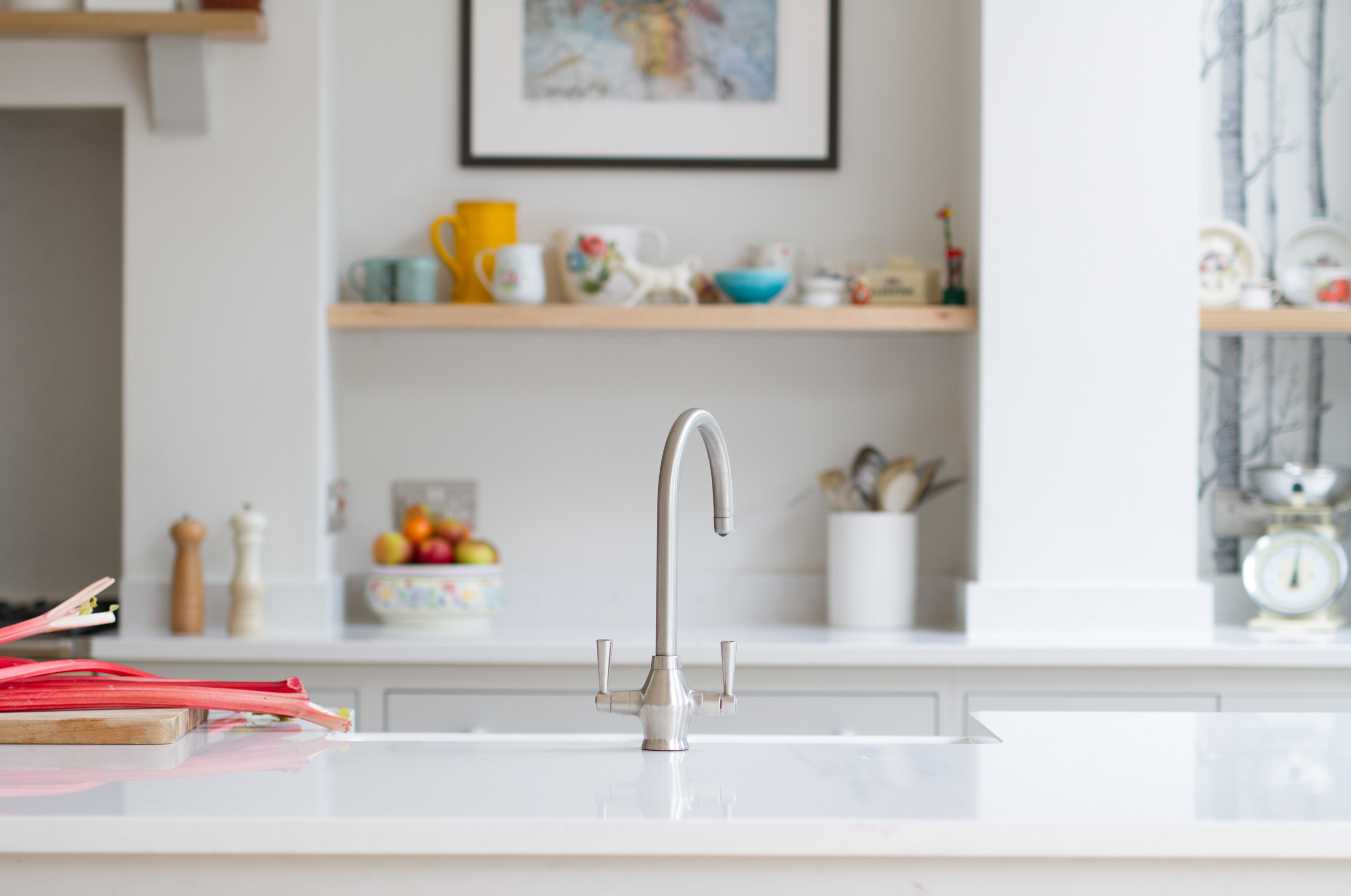 If your budget is around $1,500: Paint, art, new lighting, open shelves, a new sink and then a makeover for your cabinets. Brand-new cabinetry is one of the higher-cost items in a kitchen remodel, so if you can avoid it, do! If your cabinets are in pretty good shape, repaint them, following the necessary steps to preparing them for their new finish. Then replace the old cabinet knobs and pulls. Know that if your cabinets need to be refaced — which involves replacing rather than just repainting the doors — the cost will be significantly more.