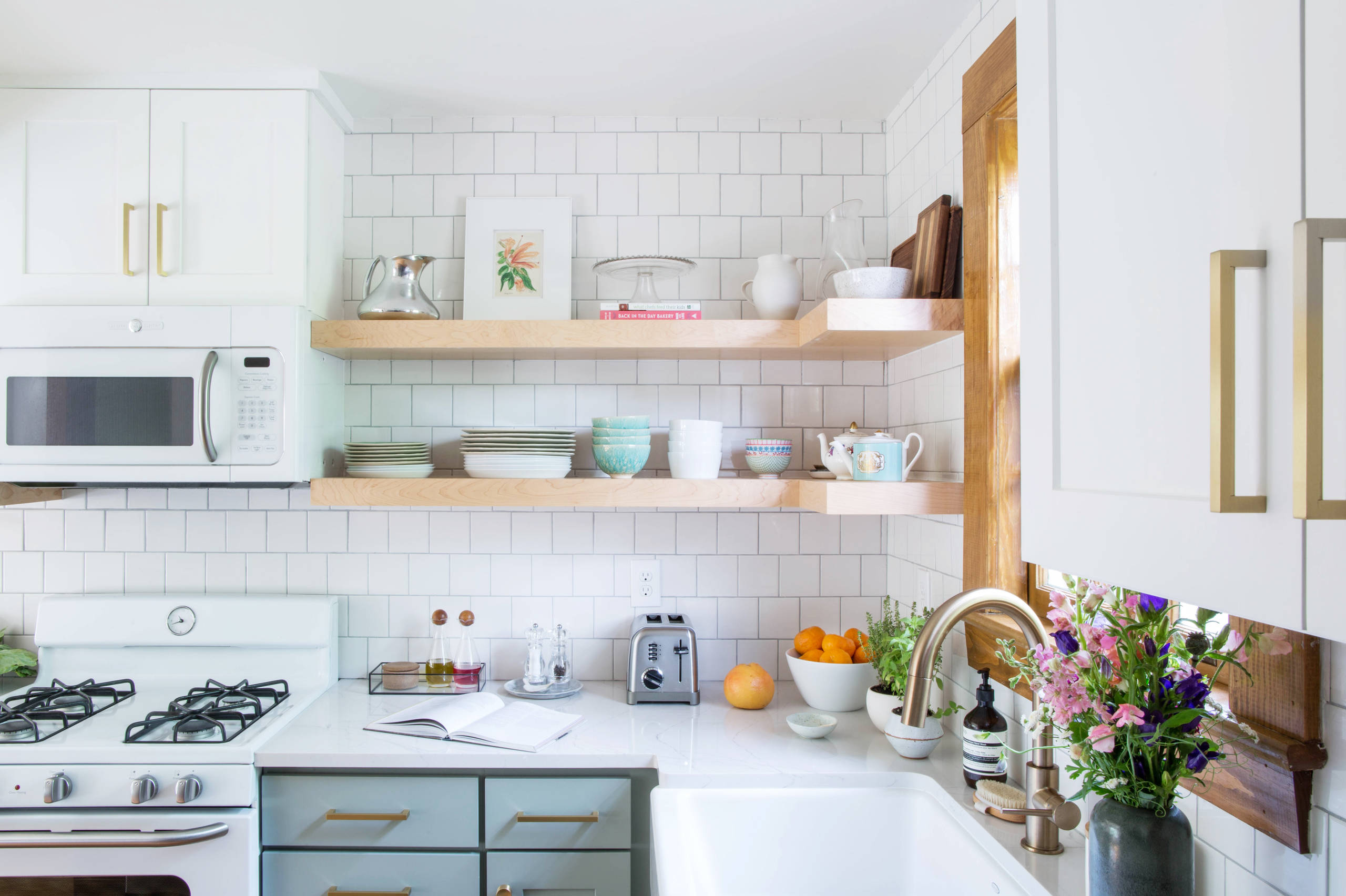 If your budget is around $10,000: Paint, lighting, open shelves, a new sink, refreshed cabinets, new counters … what’s left?