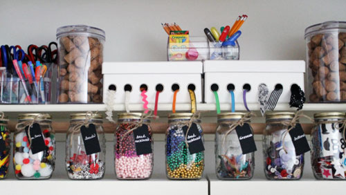 She points out that these supplies don’t have to be expensive. Target, Cost Plus Word Market, The Container Store and The Organizing Store are some of her favorite sources for affordable supplies. “There are also so many ways to creatively organize crafting supplies with items from around your house. For example, use old jam jars instead of buying new ones,” Byrne suggests.