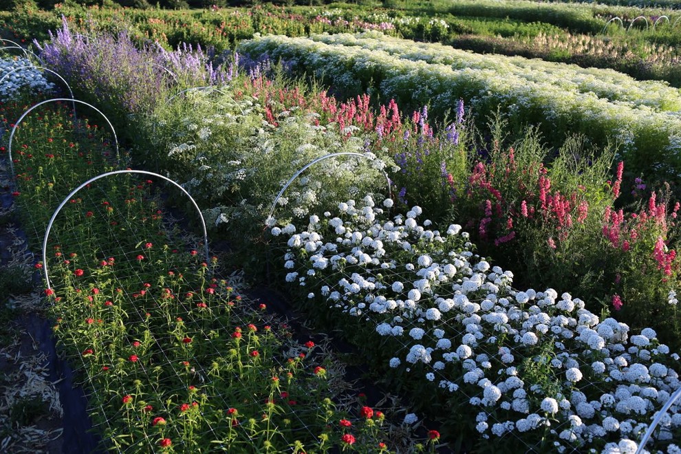 Sweet William, larkspur, feverfew and Queen Anne’s lace grow in packed rows on Benzakein’s farm. Metal hoops hold up flower netting used to keep the crops from falling over in the wind and rain.