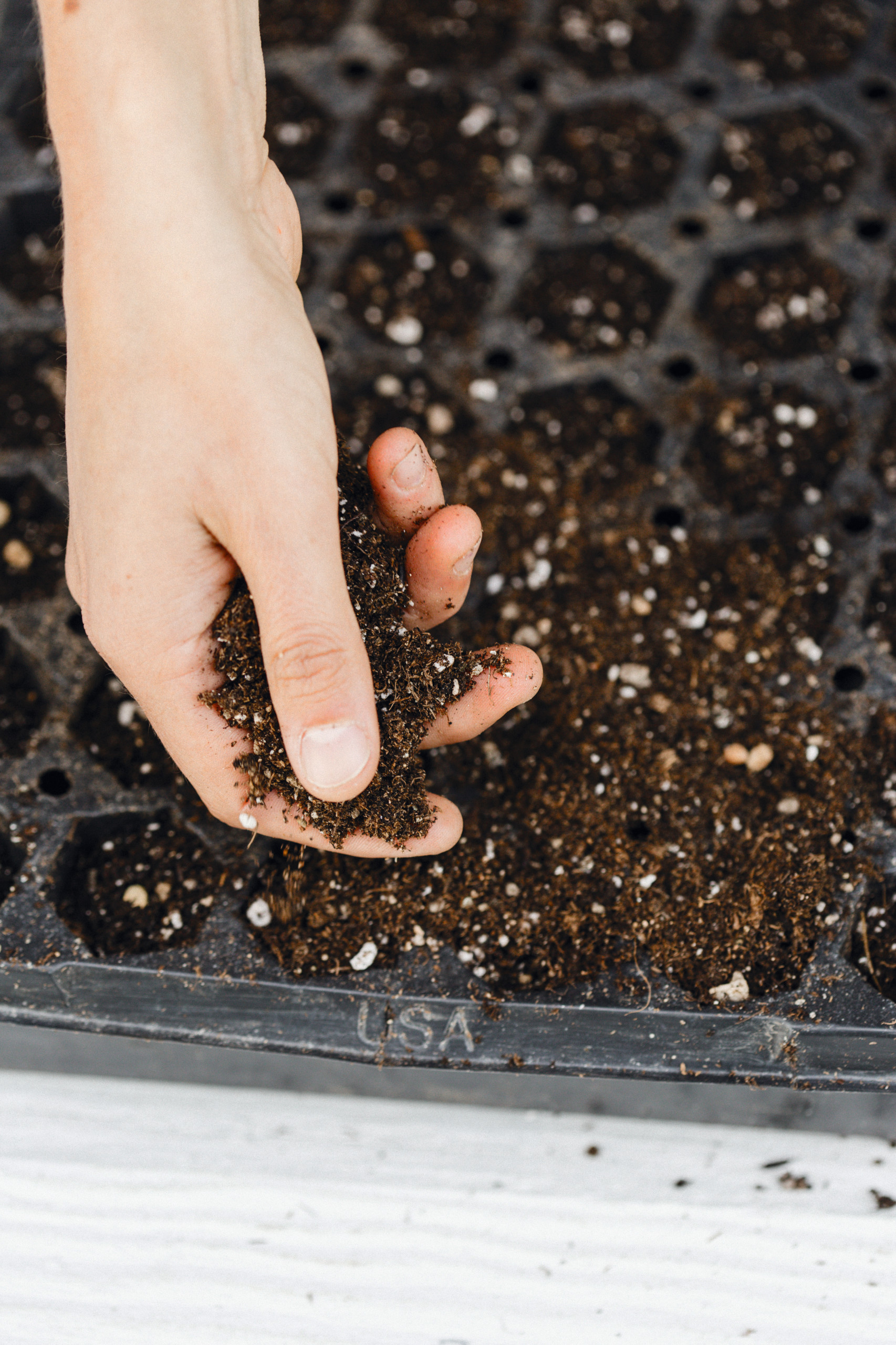 2. Fill seed flats or pots to the top with soil, tapping them firmly against the table as you go so that the soil settles in and there are no air pockets trapped in the tray cells or pots.