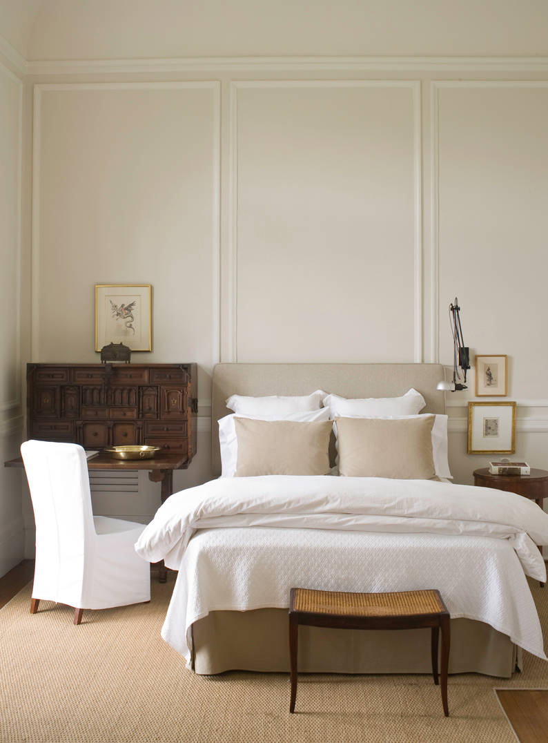 Use a desk as a nightstand. Speaking of inventive tables, an older desk or similar-size console or cabinet can make a very elegant nightstand. Don’t worry about having a matching pair; you can use something completely contrasting on the other side and celebrate the asymmetry. The layout will be anchored by the bed, so it will still look balanced and centered regardless of the different tables.