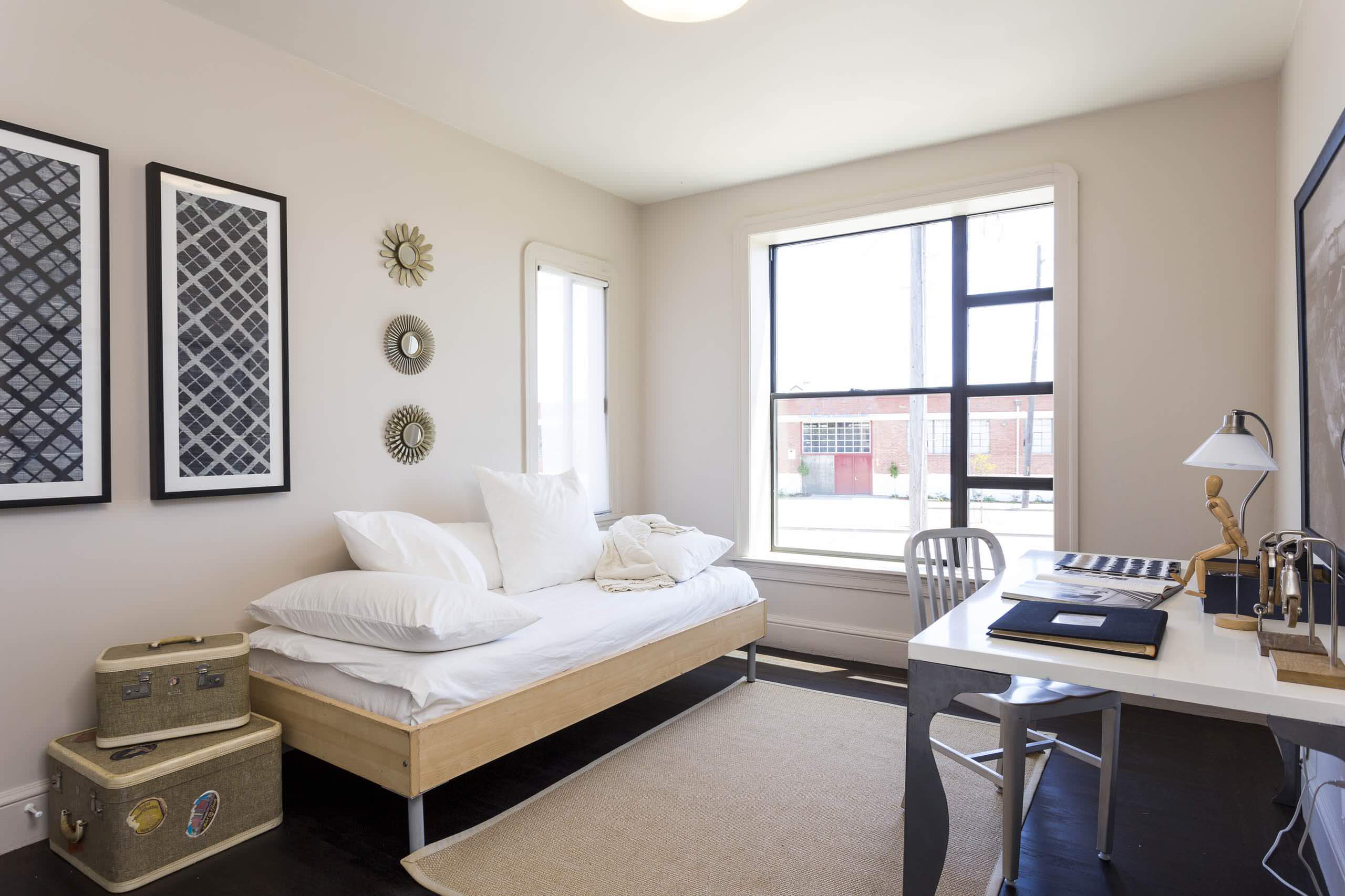 Buy a minimalist bed frame (or reuse the one you had) and push it against a wall, or choose one with sides. Pile on a few pillows and you’ve got a comfortable sofa for lounging and a spare bed for guests.
