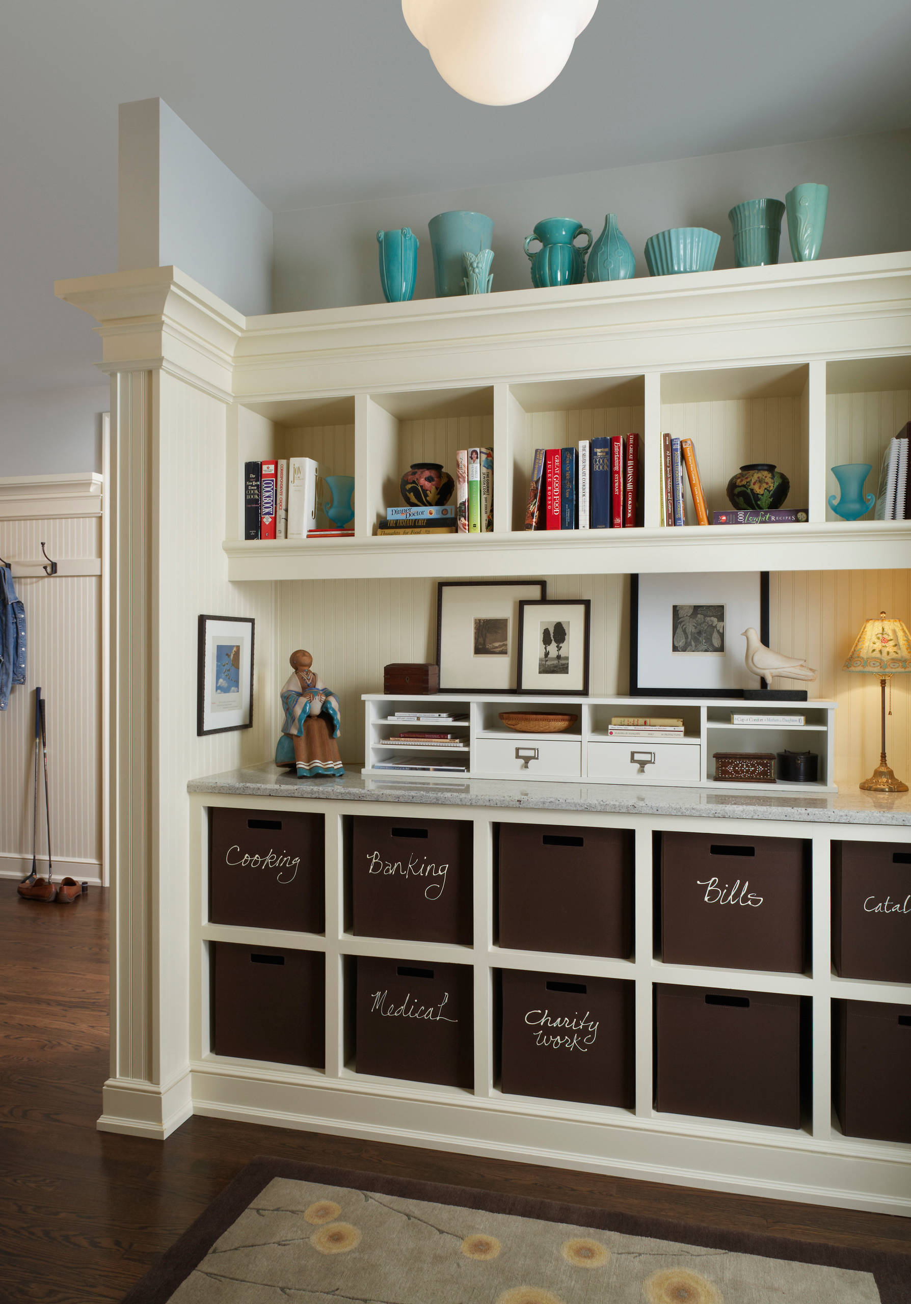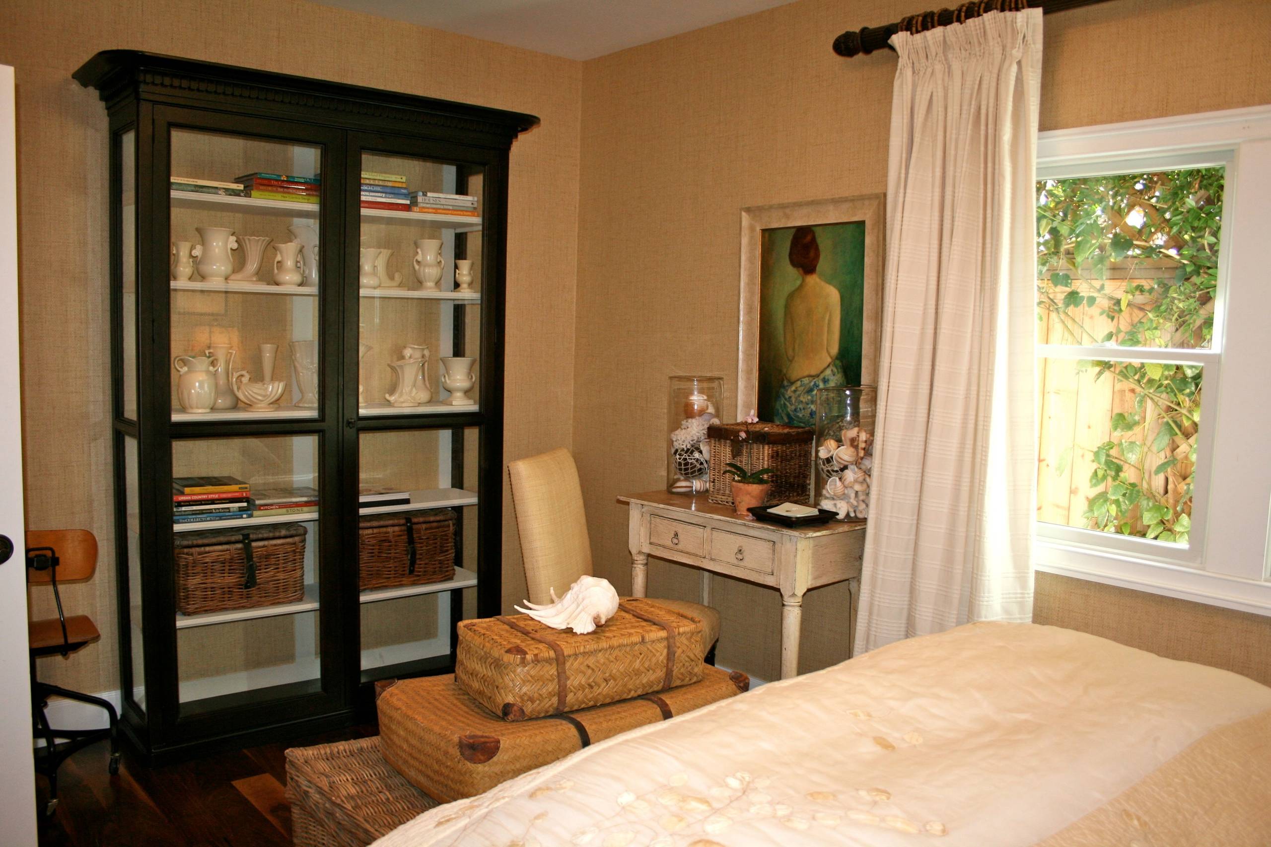 Don’t go too large with your pieces but do choose a variety of sizes to keep the decor from fading into the background. To add a little formality, arrange your pottery behind glass doors but in plain view.