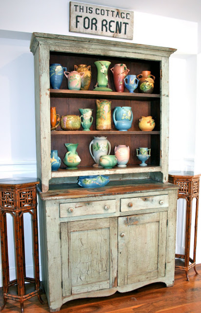 Rustic. For those who prefer a rustic, farmhouse style, hand-painted pottery is the perfect addition. To make the most of pieces in vibrant shades, keep them together en masse. The timeworn style of this antique hutch provides the right counterpoint to the intricate motif of the vases.