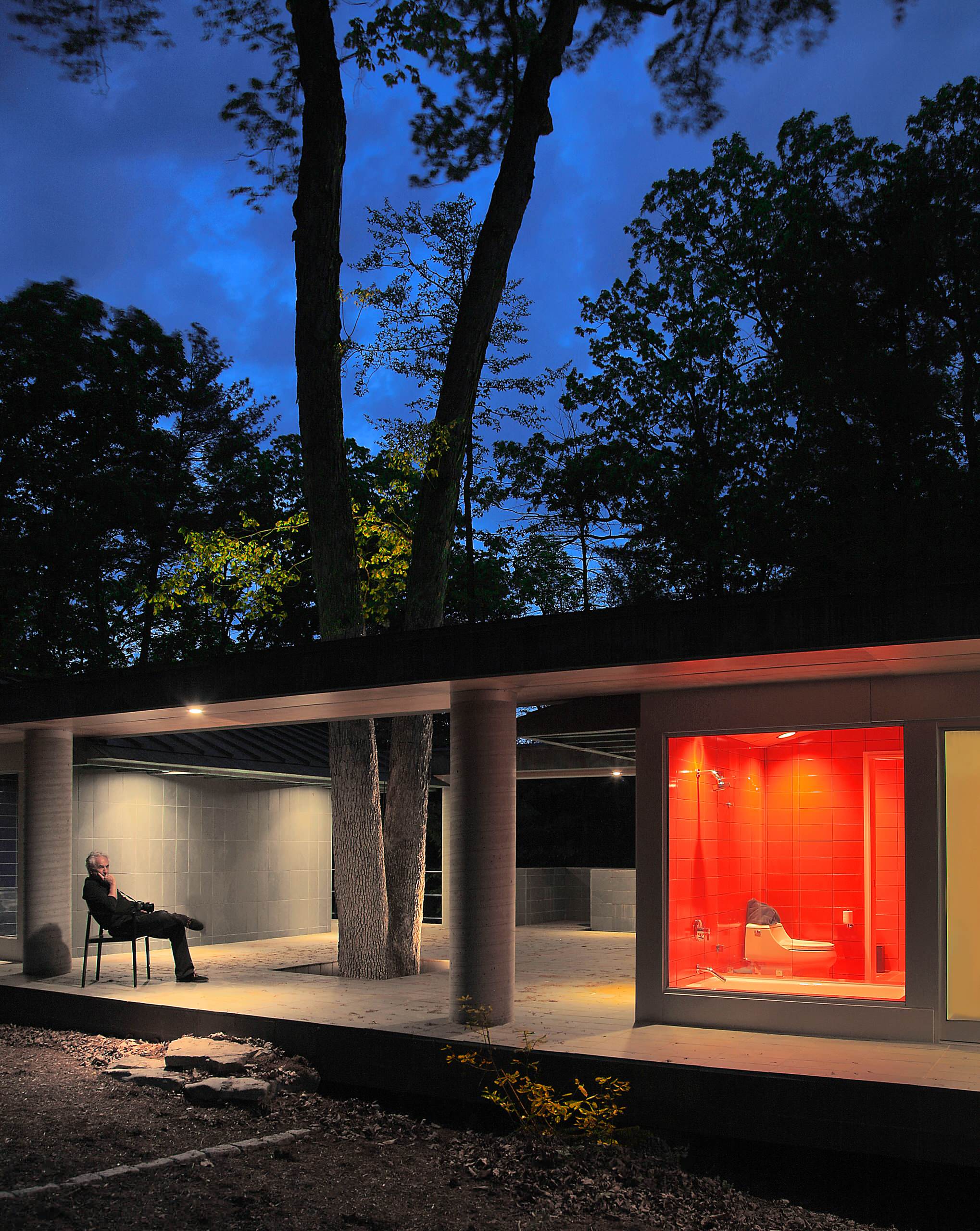 Here, the home floats above the ground on pilings, and the tree trunks are surrounded by glass with an opening to the sky. This doesn’t provide the roots underneath the platform with much access to rainfall. Instead, a timed irrigation system waters the roots under the home to ensure that adequate water reaches the trees.