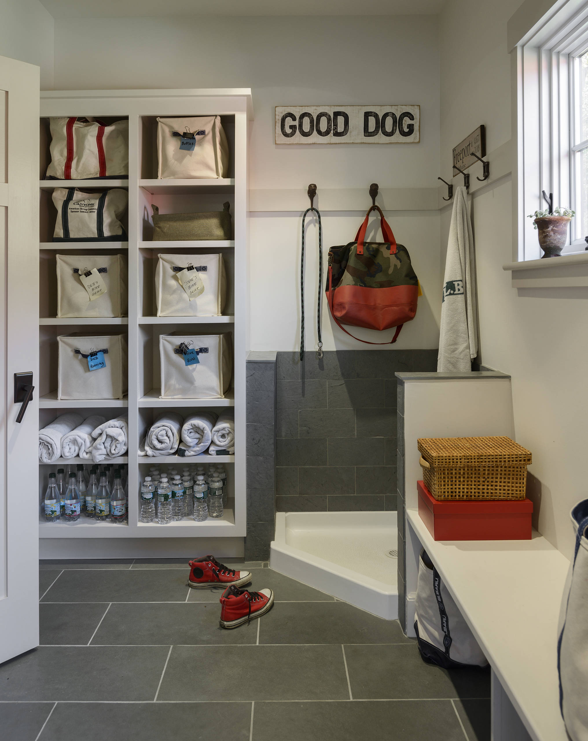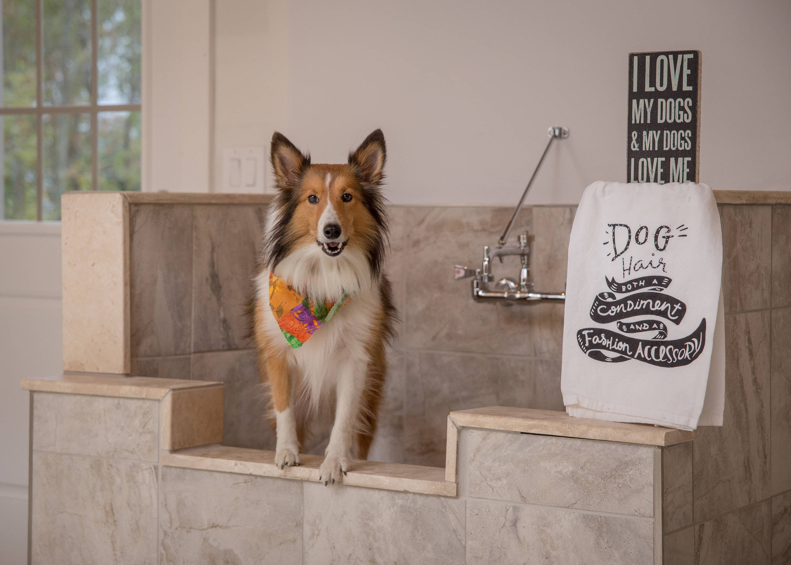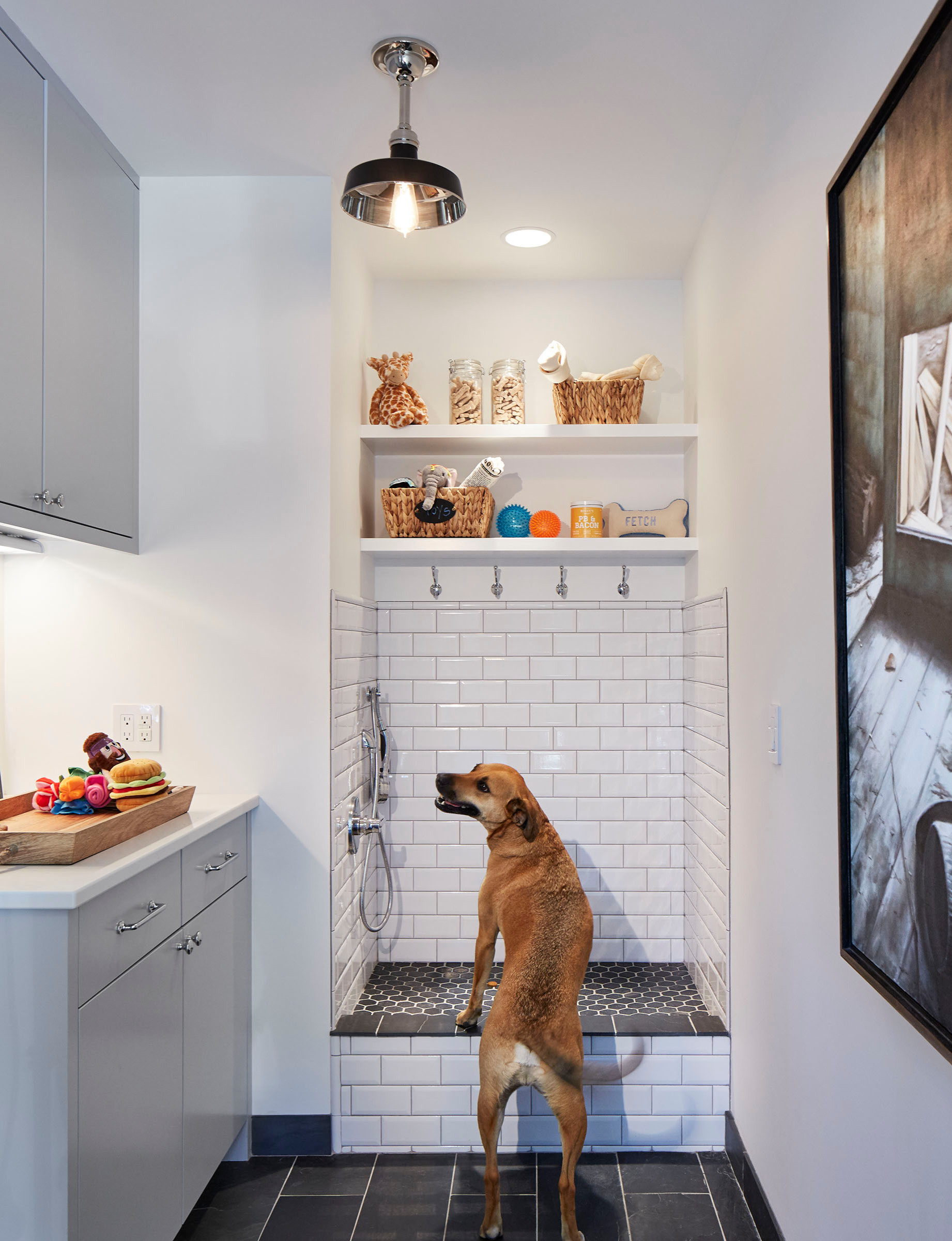 Wenn Sie Ihren Hund nicht in der Badewanne oder Dusche im Badezimmer reinigen wollen oder können, ist die Einrichtung einer kleinen Reinigungsstation, etwa in der Waschküche oder – soweit vorhanden – dem Mudroom, in der Nähe des Eingangs ideal. So können die Tiere gesäubert werden, ohne große Spuren im Haus zu hinterlassen.