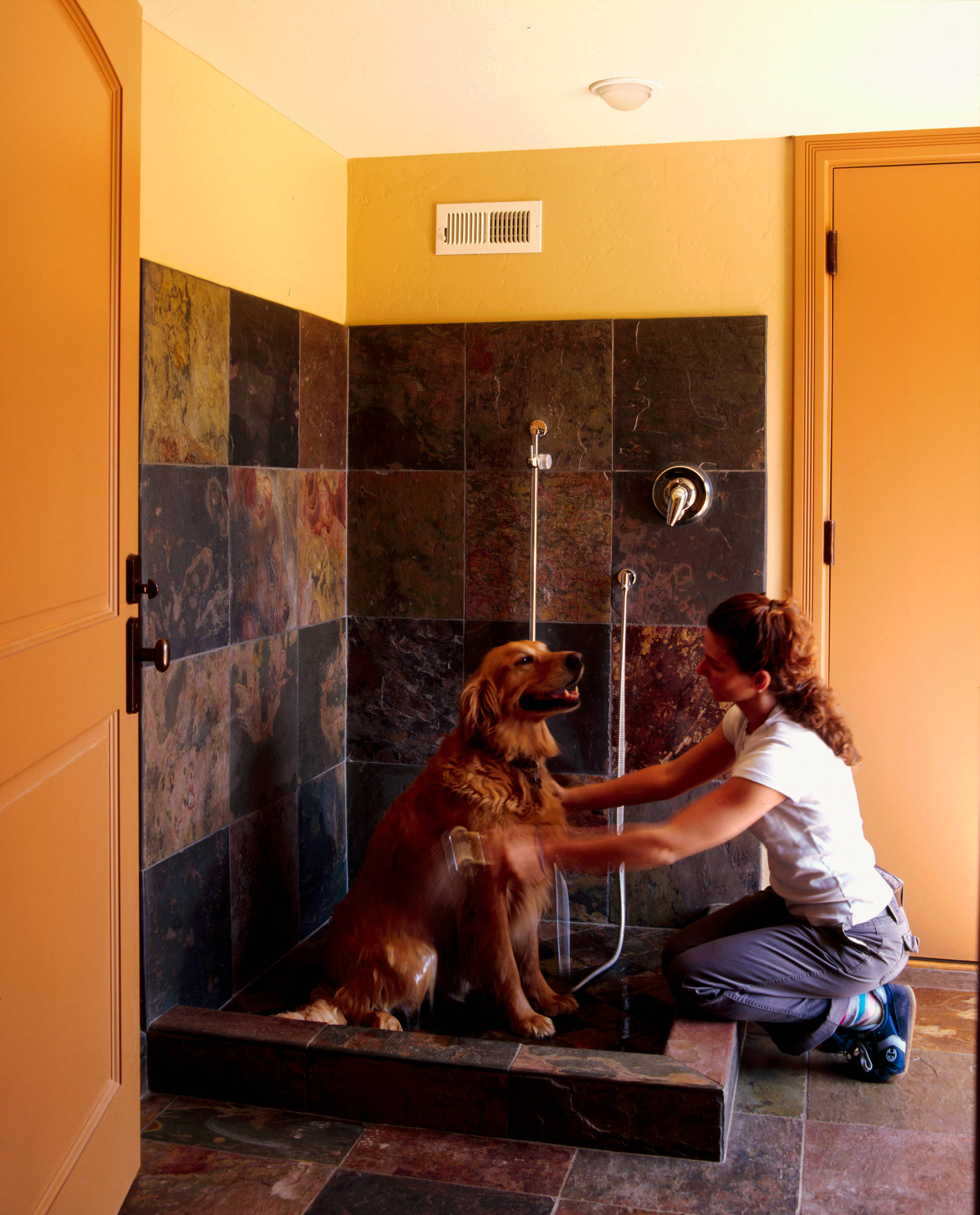 Da Hunde einen natürlichen Schüttelreflex haben, kann es nach – oder bereits während – der Hundedusche recht nass um ihn herum werden. Ein halbhoch oder höher gefliester Duschbereich ist daher praktisch.
