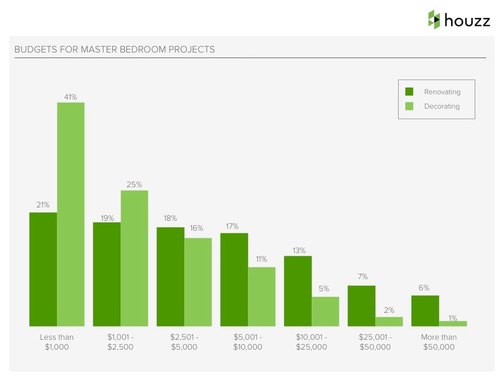 To give you an idea of what your bedroom project might cost, the graph here shows a breakdown of budgets for renovating and decorating. About 1 in 5 people who are decorating are budgeting $5,000 or more. Meanwhile, a quarter of homeowners are budgeting or spending more than $10,000 on renovations.