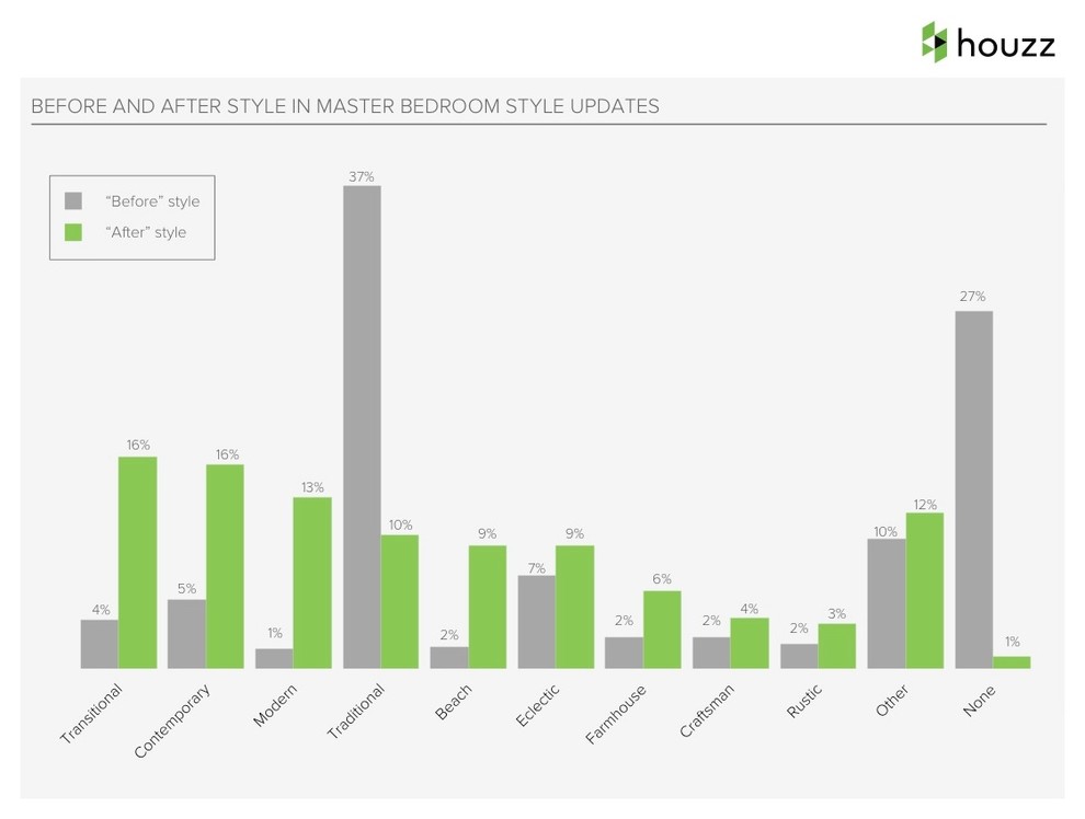 Consider taking this opportunity to do something new and fresh. Not sure where to begin? Know that among survey respondents who changed the style of their master bedroom, 45 percent chose transitional, contemporary or modern style.