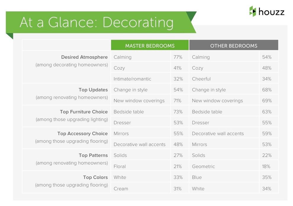 A new Houzz survey gathered data from more than 1,500 homeowners who completed a bedroom renovation or decorating project within the past 12 months, are currently working on a project or plan to start one in the next three months. Many of them are probably like you: They could no longer stand their old bedroom, and decided it was time for a change. The majority of people (67 percent) said the last time they renovated their bedroom was more than 10 years ago, and nearly 40 percent said it had also been a decade since they last decorated.