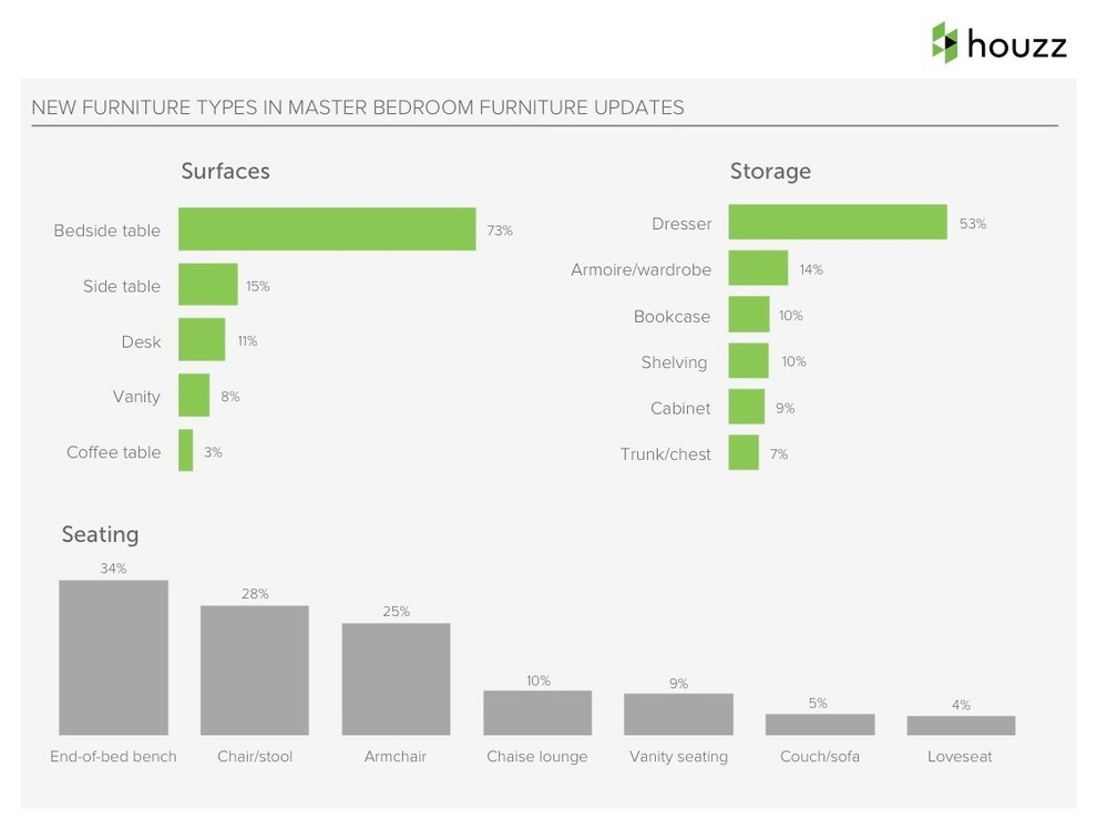 Bedside. Of course, you’ll need a place to put a lamp, books, glasses, your cell phone and other nightly essentials. According to the survey, half of those decorating their master suite opt to upgrade furniture. The majority of furniture updates (73 percent) include at least a new bedside table. And you should consider interpreting the word table loosely. Many homeowners opt for something a little more creative, such as trunks, vintage suitcases and stacks of books.