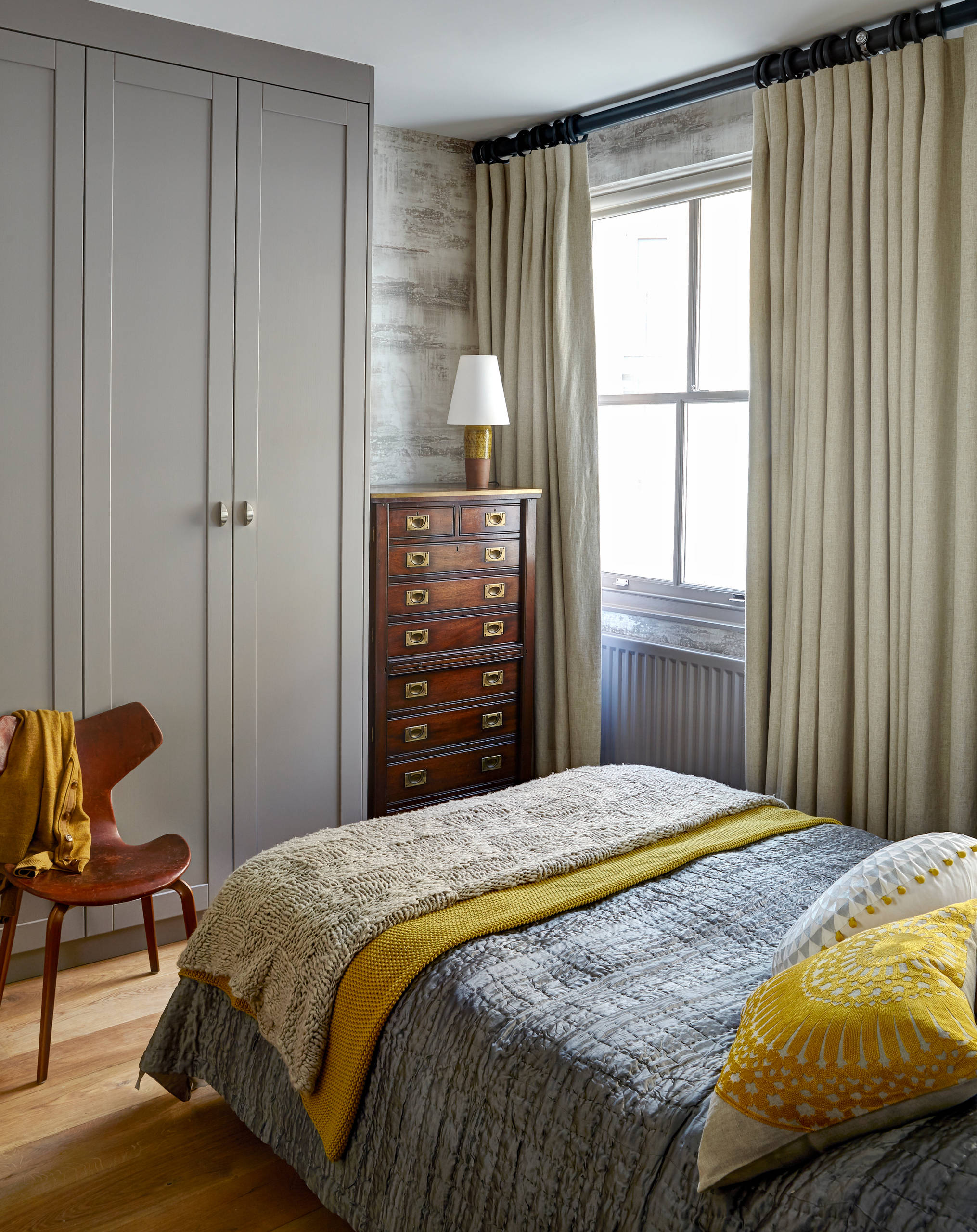 Again, consider what you want to achieve. If you’re a morning person who enjoys the first dapple of morning light — and your bedroom window doesn’t face any neighbors — perhaps you want something a little sheer or barely there. If you prefer your bedroom more like a cave throughout the day, look at window treatments that block as much light as possible.