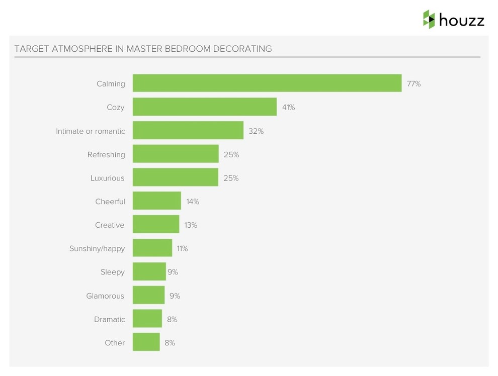 Atmosphere. What your bedroom feels like is different than its style. Most people (77 percent, according to the survey) want a calming environment in the bedroom. Which makes sense. Many of us spend much of our days in overdrive — commuting, working, chauffeuring the kids around, cooking, cleaning — so we want to retreat to a sanctuary at the end of the day.