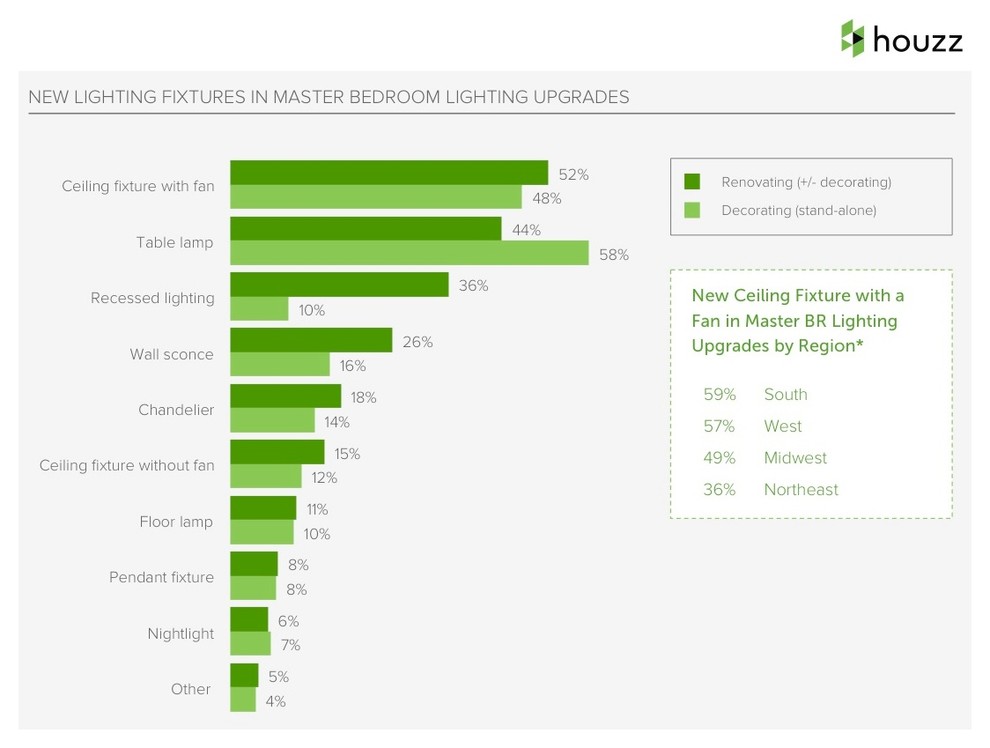 Lighting. As with any space, lighting plays an important role in delivering the desired atmosphere. After all, it’s hard to have a romantic environment with a fluorescent light flickering overhead. Despite the fact that some people say ceiling fans are unfashionable, homeowners still love them and want to include them. According to the survey, 70 percent of renovators and 49 percent of decorators are updating lighting in master bedrooms, and half of both groups (52 and 48 percent, respectively) will add or have added a ceiling fan with a light fixture.