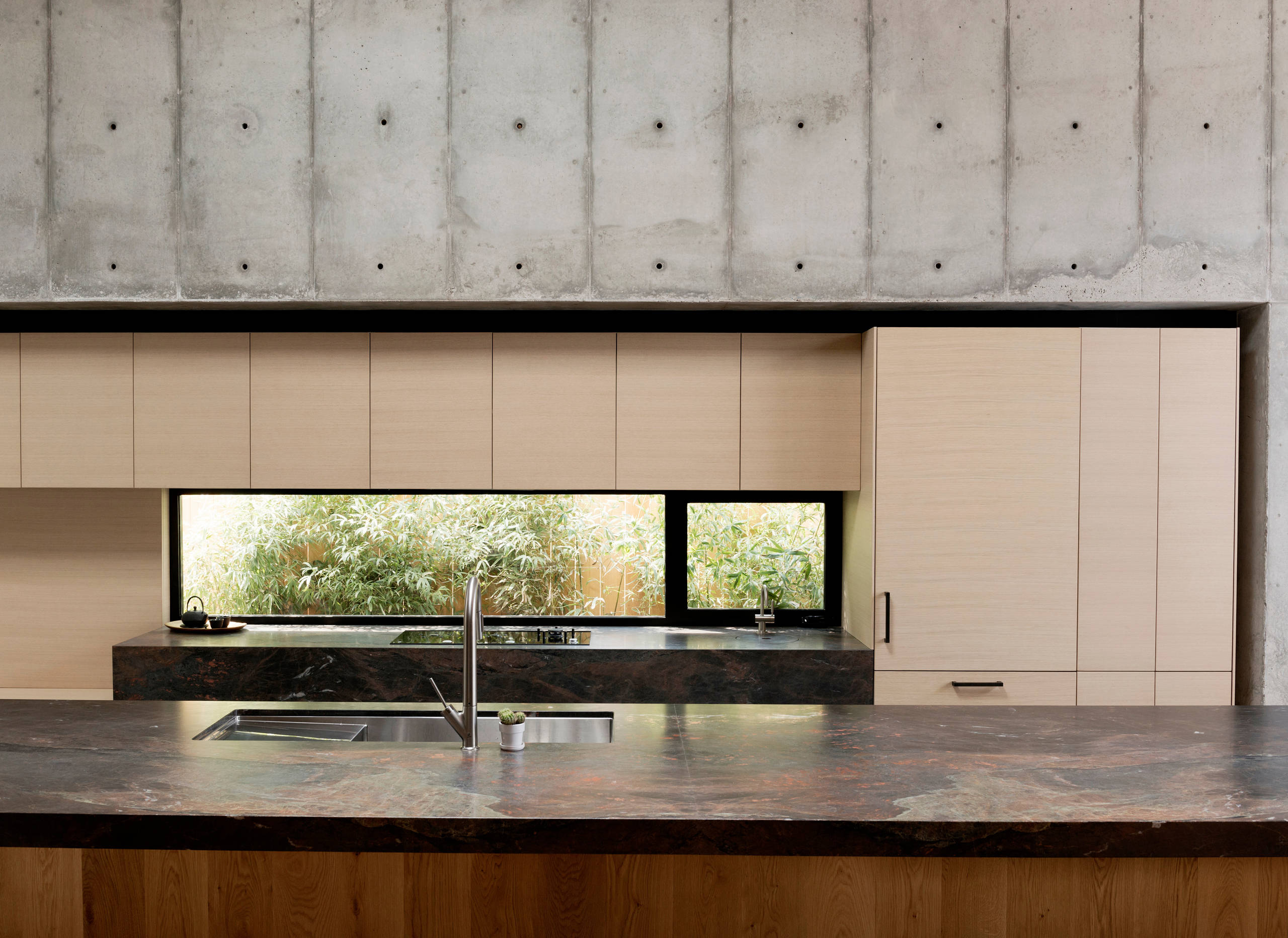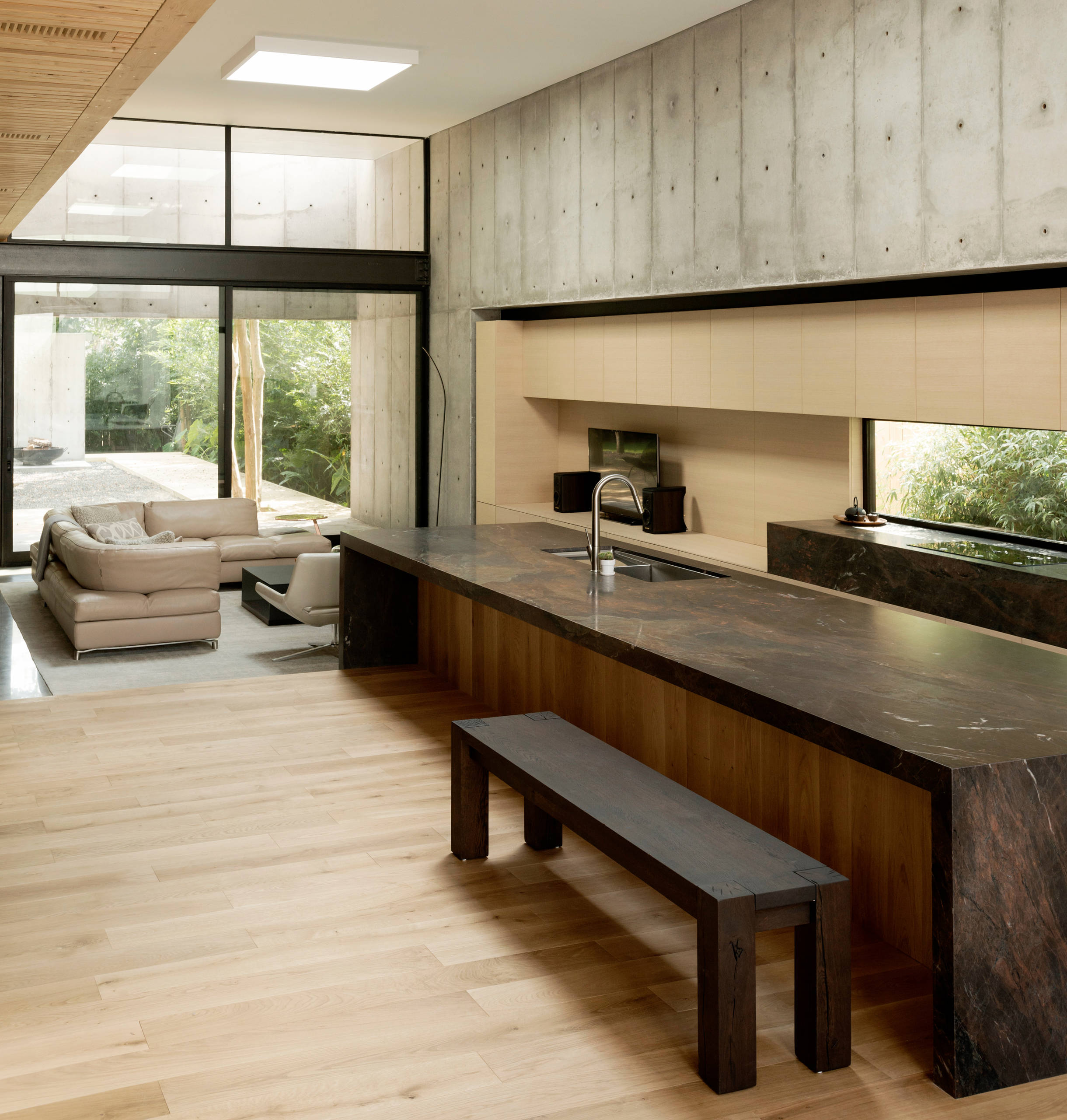 For this open-plan space in Houston, Texas, homeowners and architects Christopher Robertson and Vivi Nguyen introduced a barely-there concept that hides virtually all the function of the kitchen from view of the surrounding spaces.