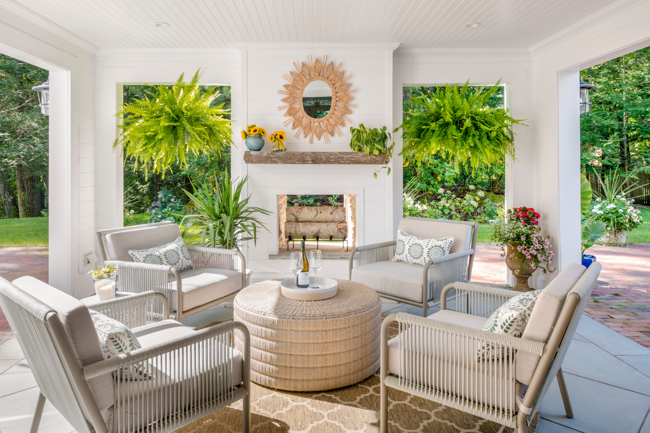 A small table next to a chair, chaise lounge or sofa should be within easy reach, much like a side table inside your home. Martin recommends allowing 24 inches between a coffee table and a sofa, love seat or chairs. “It’s enough room for people to move in and out, and close enough to keep it cozy and to be close to your drinks and nibbles without having to stand up,” she says. Side tables can be closer, as you usually don’t need to move past them to get into a chair or sofa.