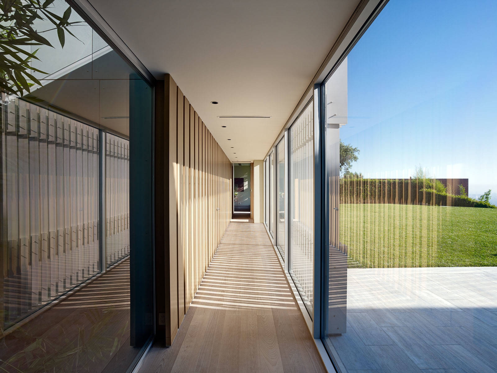 Comparing the previous example with this residence by SPF:architects reveals the language of their respective architectures. Crispness and precision combined with refined finishes define this hall. All the lines are flush, and the planes are continuous. Movement is gently suggested by the direction of the grain of the wood flooring. A narrower passage is possible without the space’s feeling too tight since one side is primarily a glass wall.