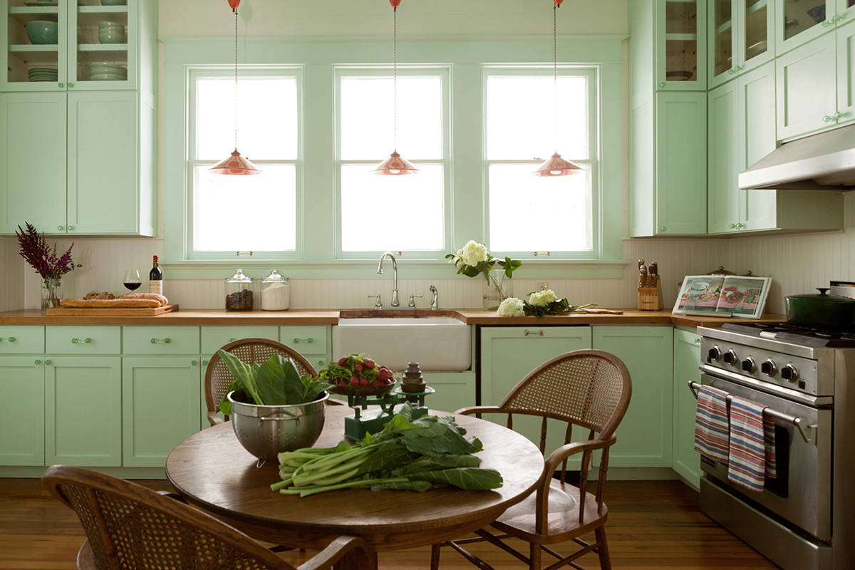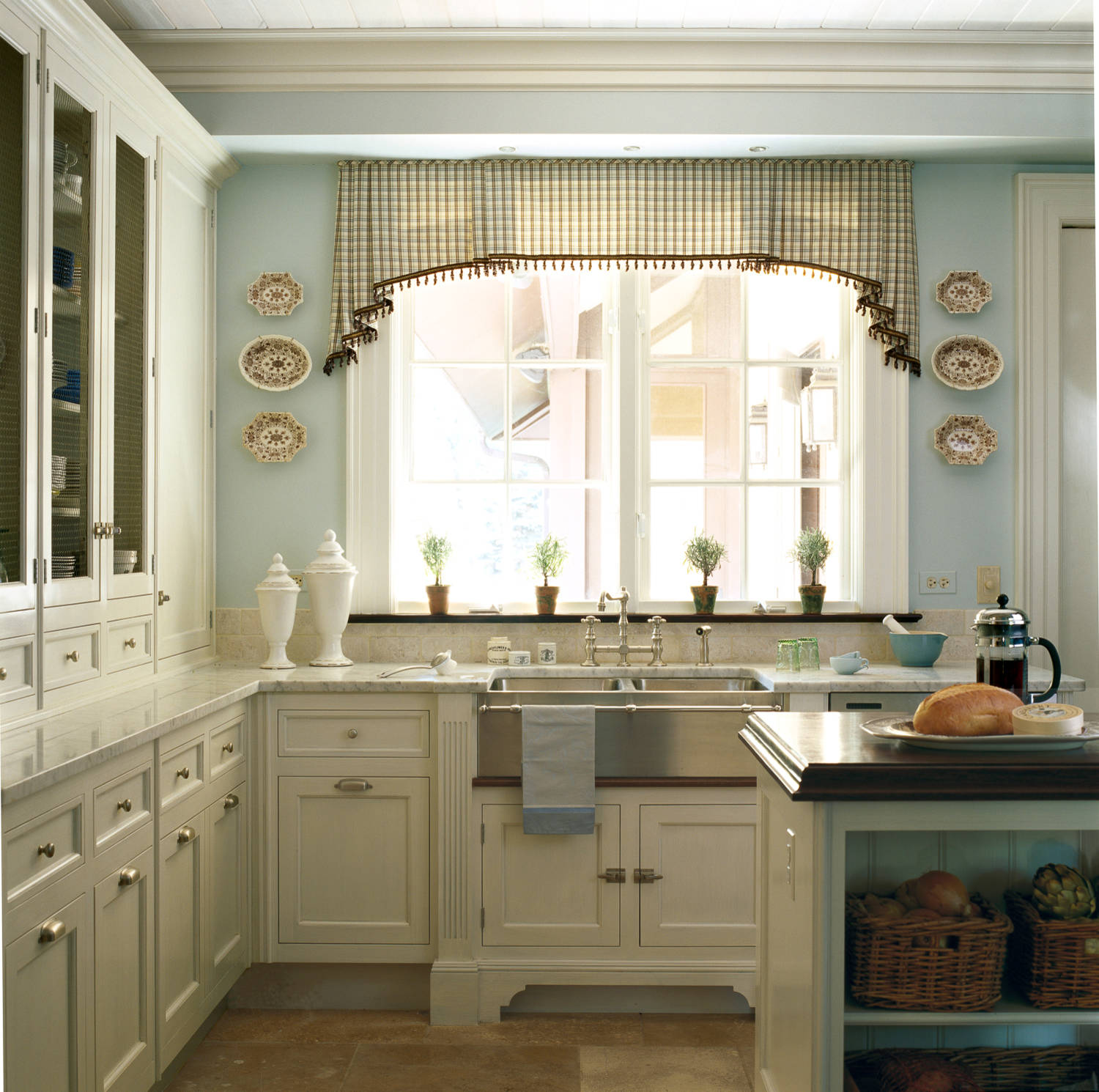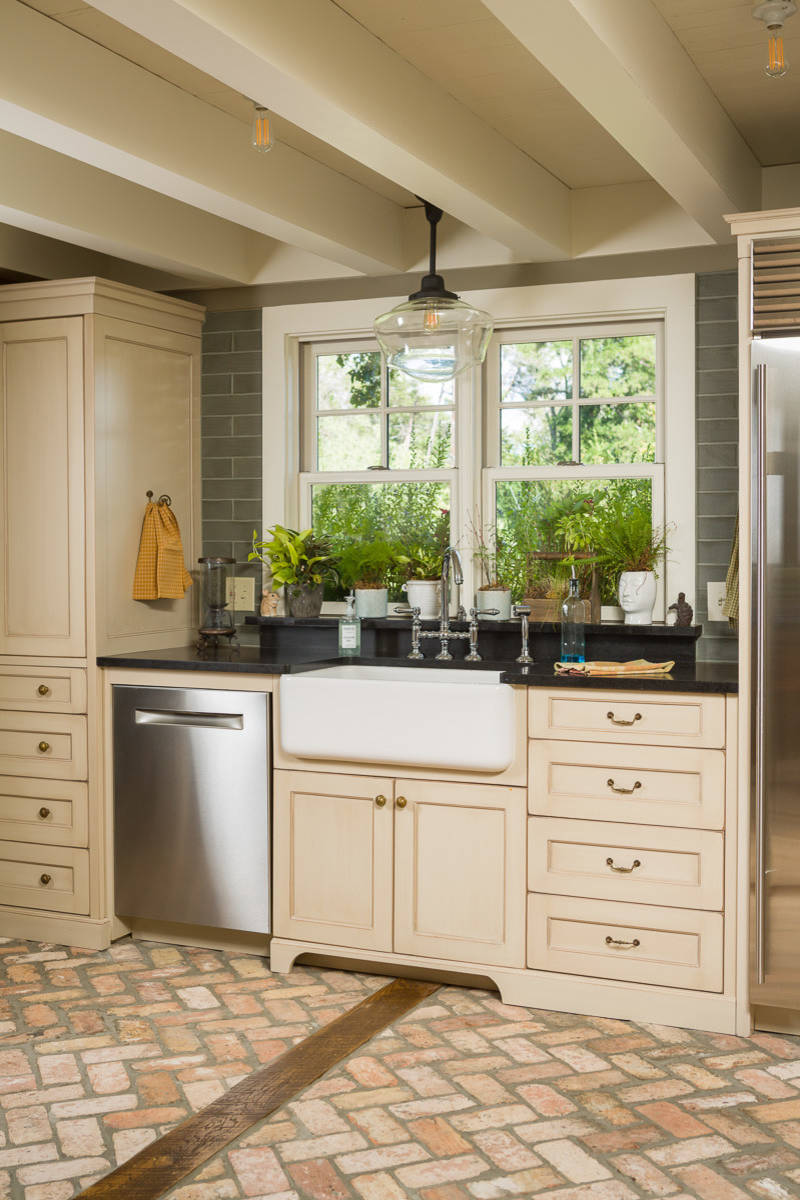I don’t even know if that sink is actually plumbed — and I don’t care because taking a yoga breath and looking at this photo may inspire us to go clear some clutter or downgrade some of our ugliest, most worn-out dish-drying towels to housecleaning towels.