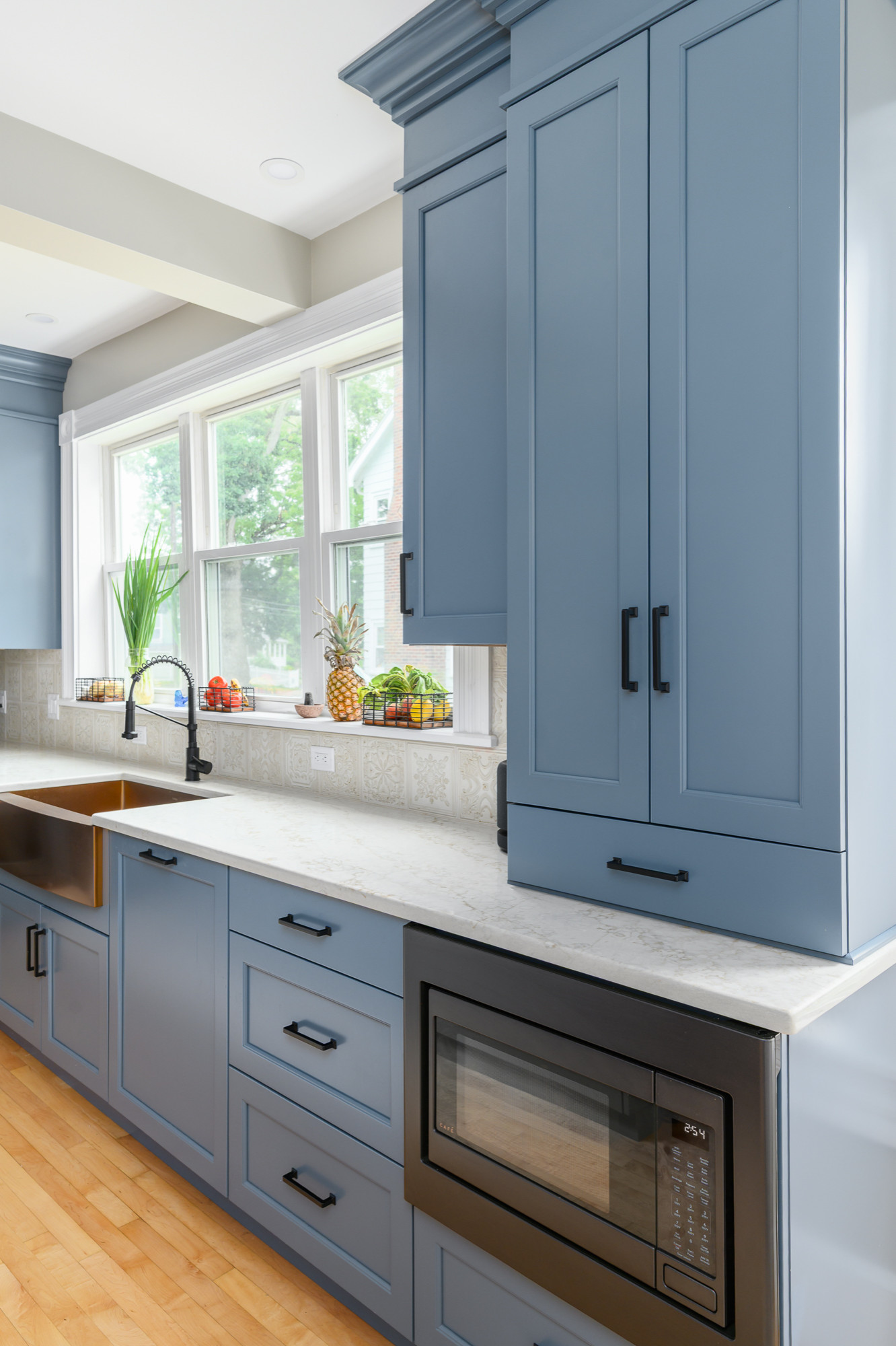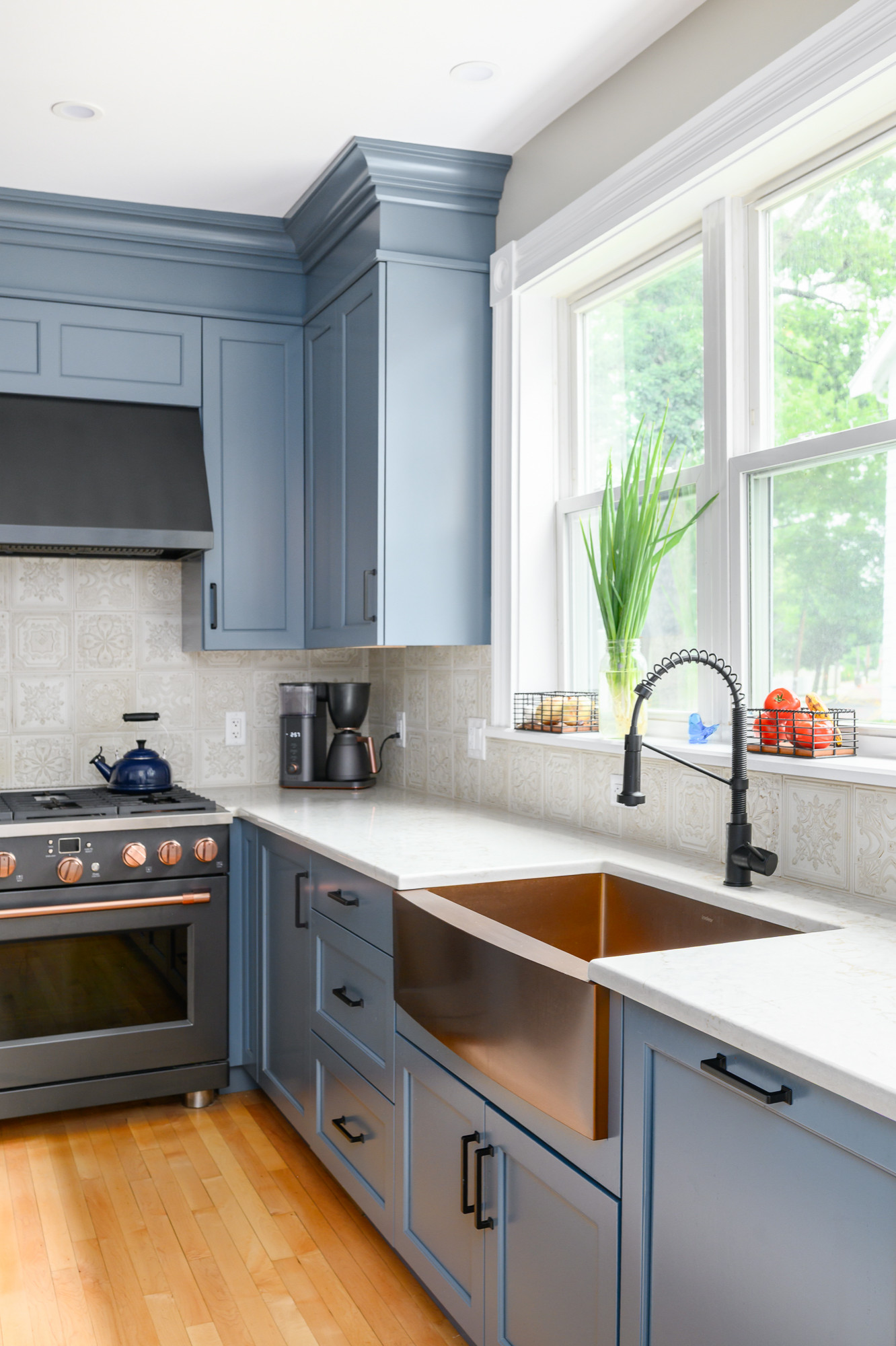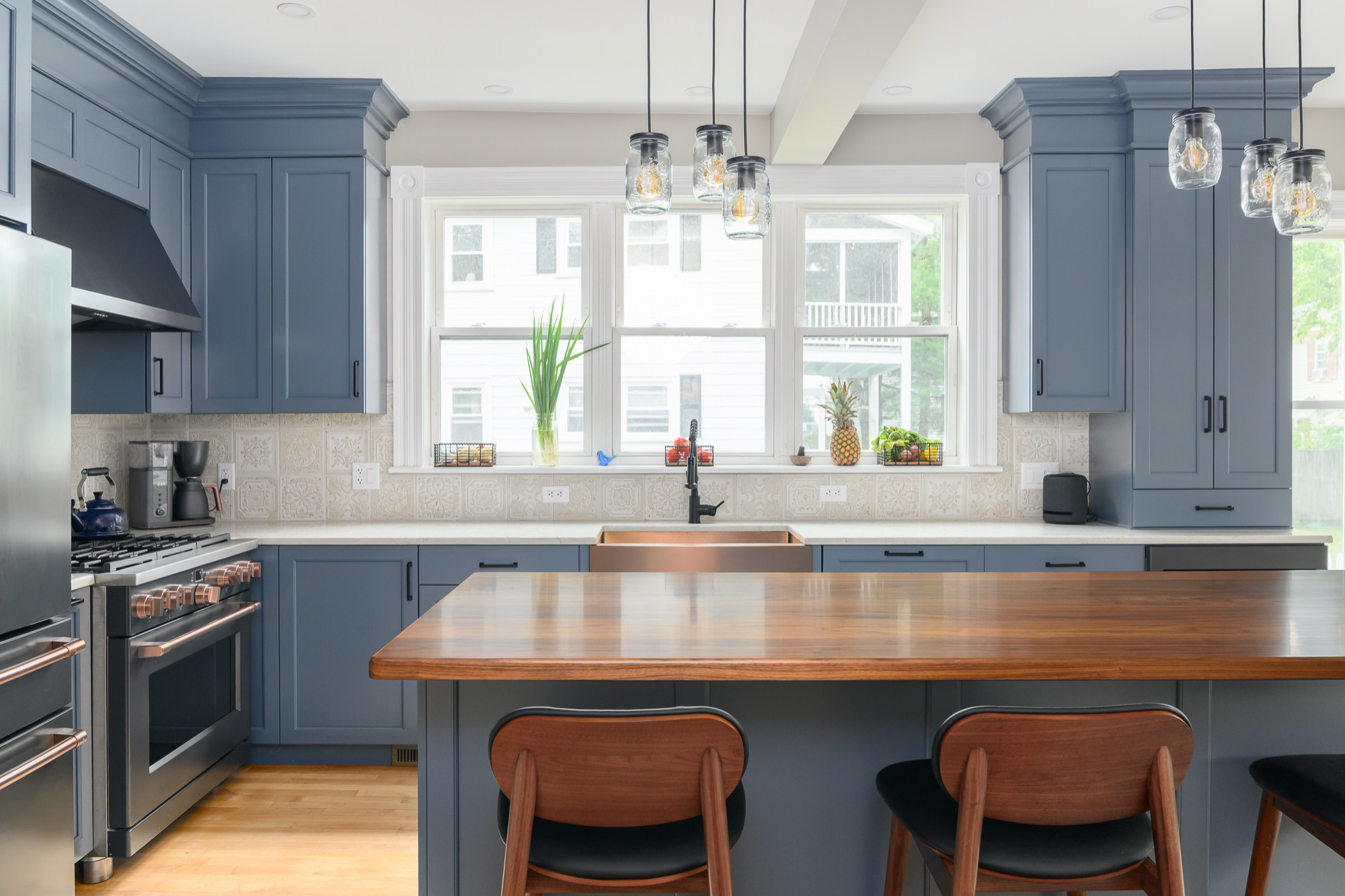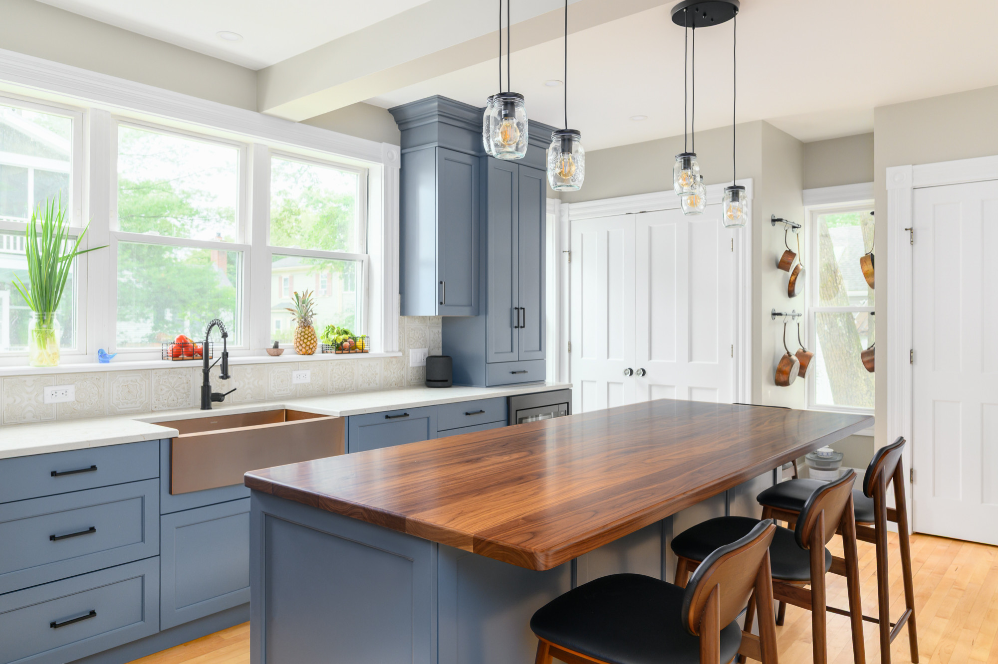 After the wife fell in love with a showroom display that paired wood with rich color, she and kitchen designer Rob Shaw of Kitchen Associates reimagined the room with a similar mix. Blue-painted maple cabinetry now provides a bold backdrop, while a new island with a walnut countertop anchors the space in warmth. Refinished wood floors and copper accents — including a striking apron-front sink — add more warm touches, while a matte black refrigerator, vent hood and hardware bring dramatic contrast. A softly patterned backsplash tile completes the look with a layer of charm.