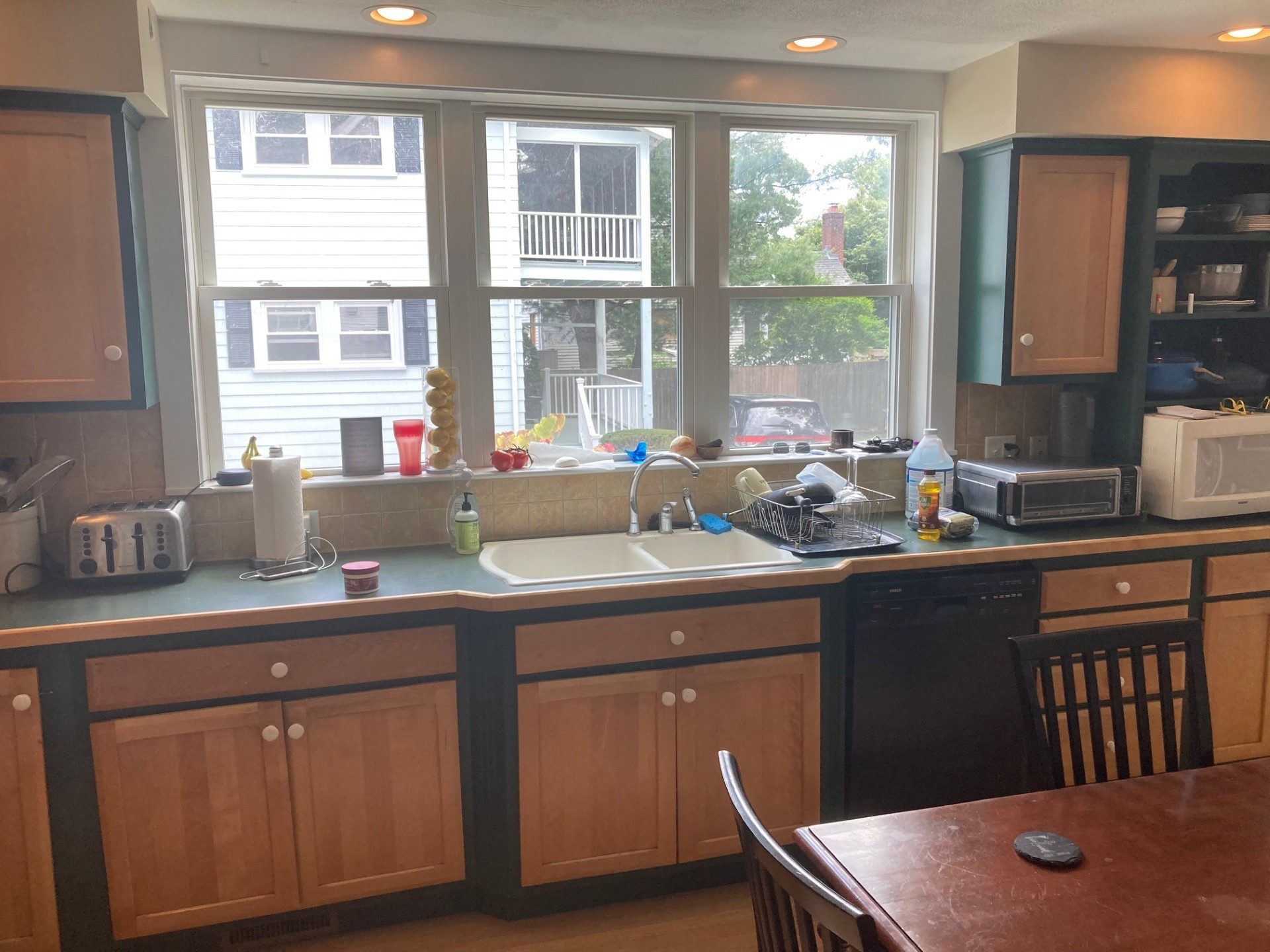 Before: The sink area beneath double-hung windows overlooking a side yard had a white double-bowl sink that made cleaning large pots and pans a challenge. The countertops were crowded with a white microwave and other small appliances. “She had open shelves on that wall there too that ended up cluttered,” Shaw says. A black dishwasher to the right of the sink clashed with the surrounding cabinetry.