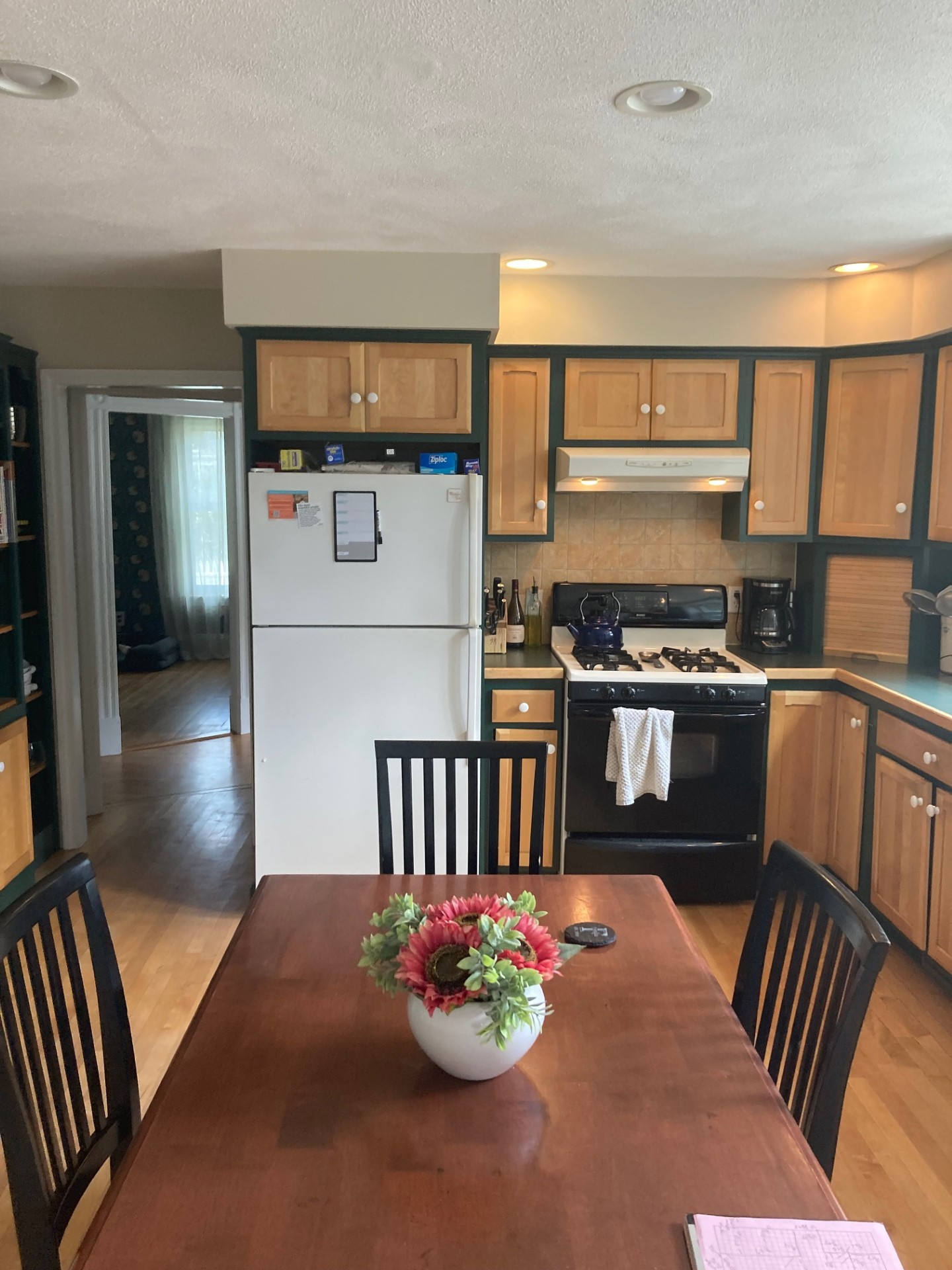 Before: In the former kitchen, short 1990s cabinets with dark green trim and white porcelain knobs sat beneath a plaster soffit, offering limited storage. A mix of white and black appliances, including a small 30-inch range, gave the room a chopped-up look. Beige backsplash tile and beige walls, along with dark countertops, did little to perk up the look. A breakfast table and chairs filled the space, but with the dining room just 10 feet away through a cased opening (out of view on the left), the homeowners preferred an island. The doorway at the back left of this photo leads to the front hall.