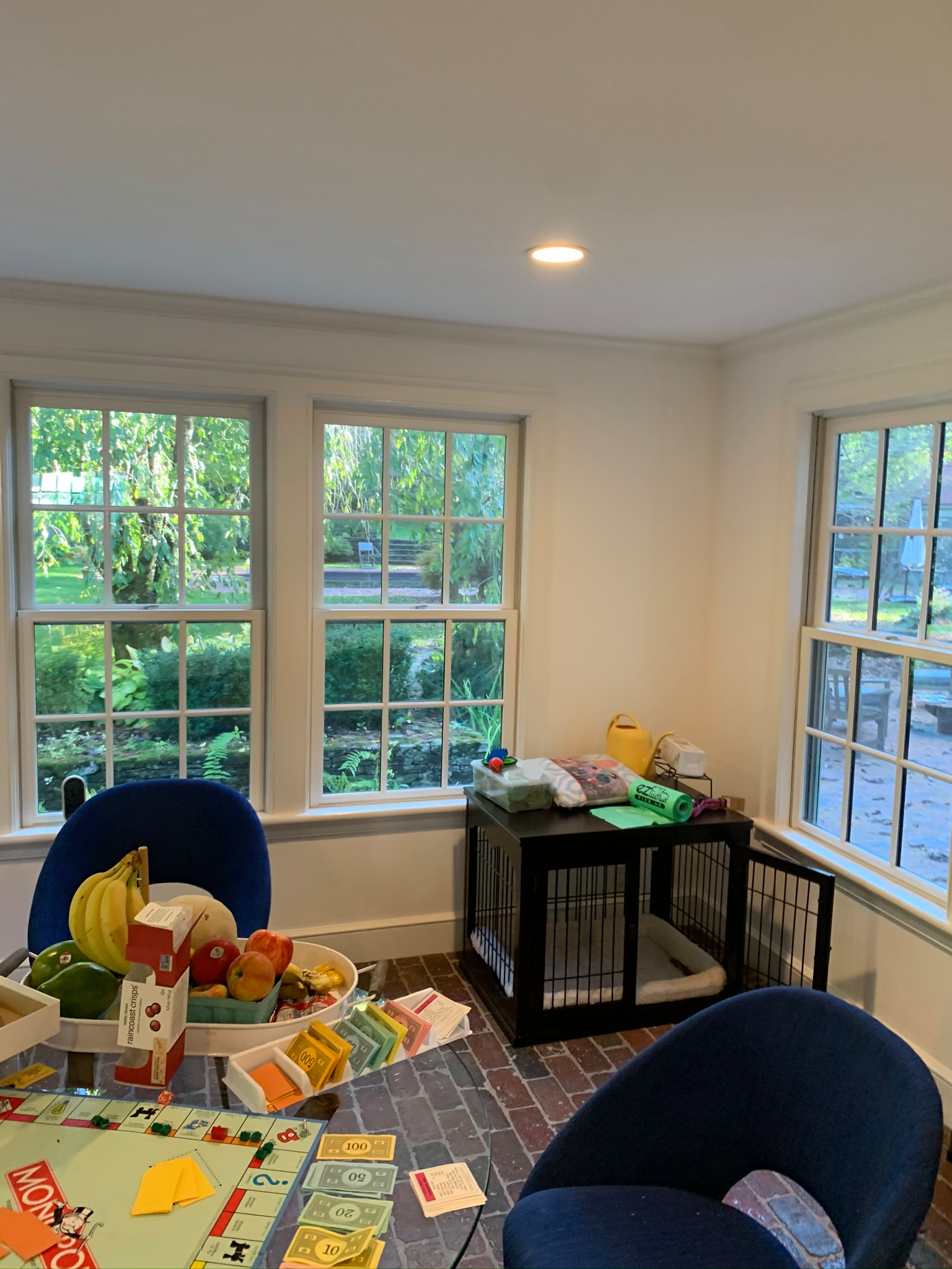 Moving the sliding glass door into the baking room and replacing it with the old kitchen window allowed for extra seating, and thus better TV viewing, along that wall. The homeowner selected the leather couch and the rest of the decor.