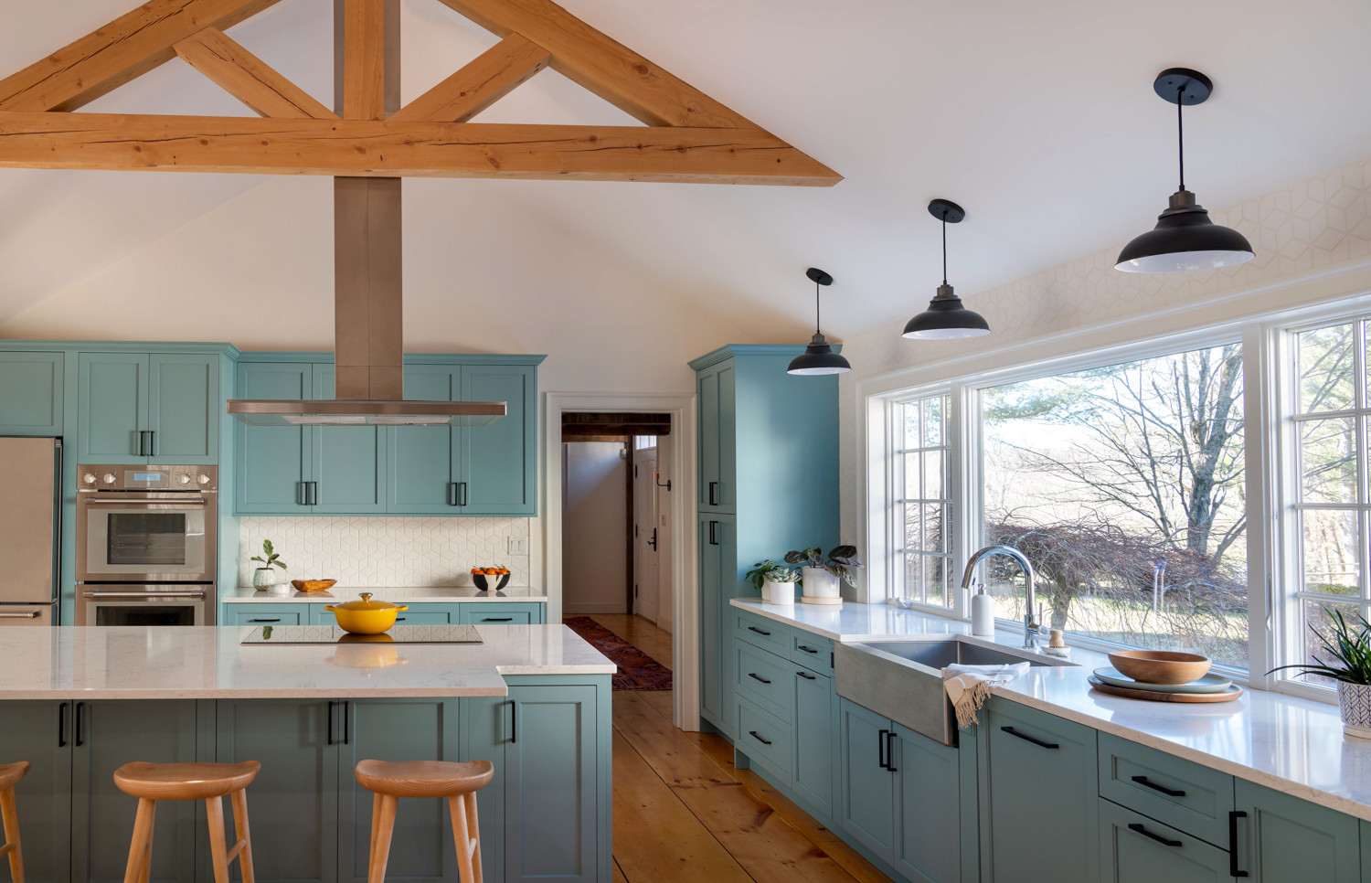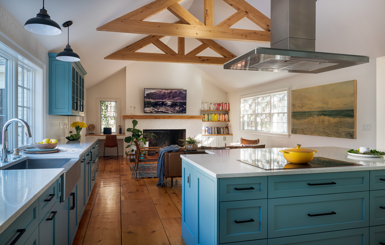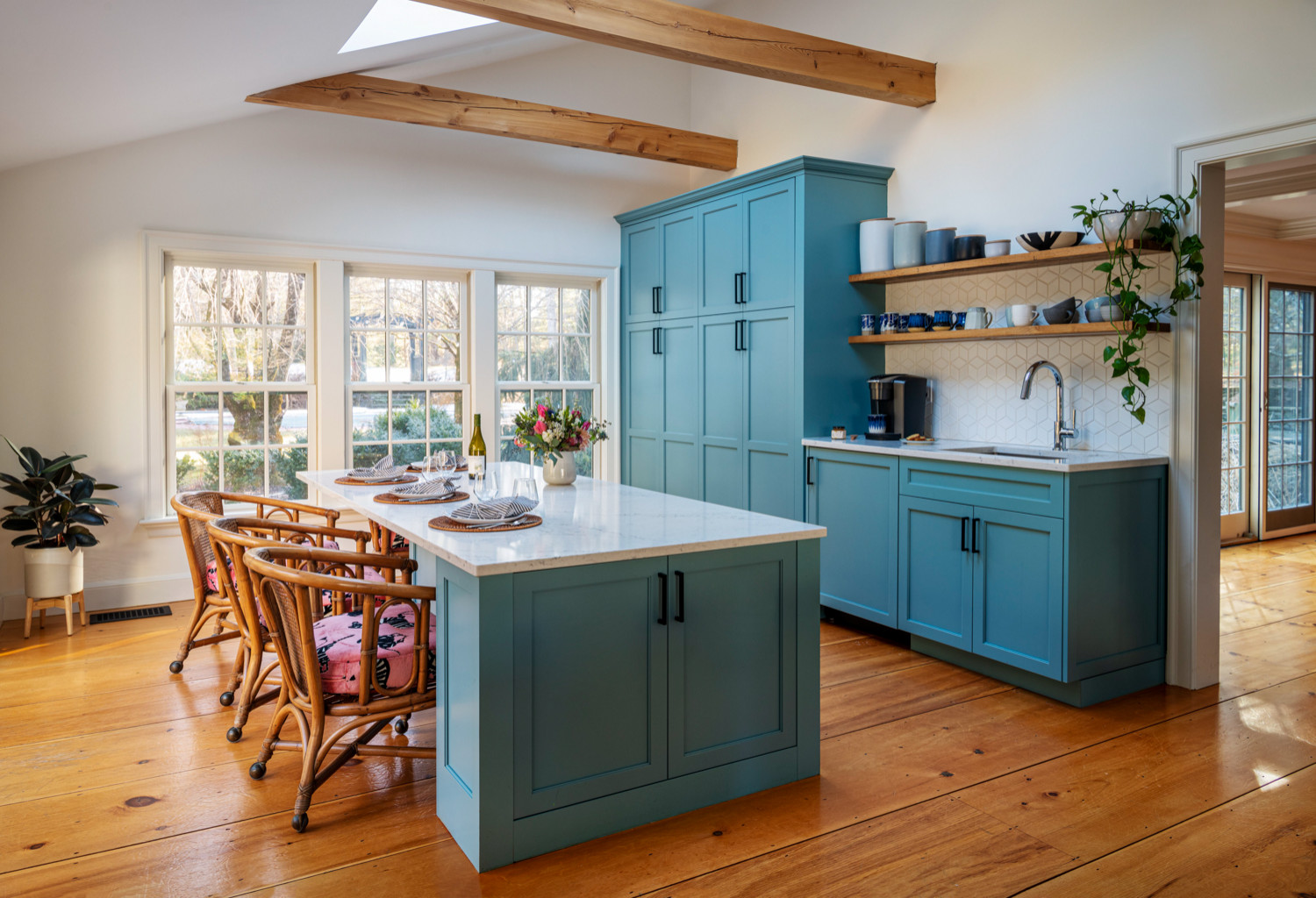 A kitchen-family room makeover adds happy' aqua cabinetry and a dedicated baking space to a Massachusetts farmhouse