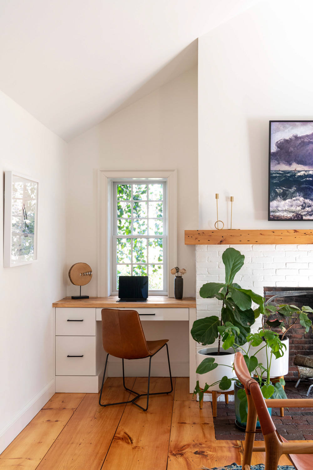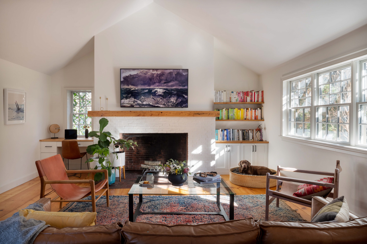 After: Swartz painted the fireplace white to better integrate it into the mostly white room, then added a mantel of reclaimed white oak and custom maple built-ins on either side. The white oak shelves on the right are filled with the wife’s cookbooks, which she organizes by color.