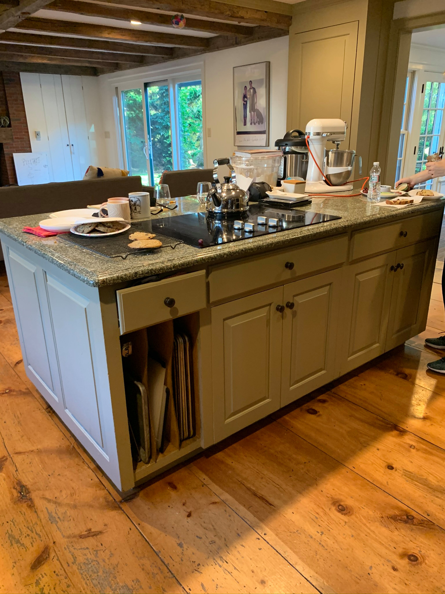 Before: This photo of the previous, smaller kitchen island also offers a glimpse of what the rest of the room once looked like. Notice the low beamed ceilings, the aforementioned slider doors and the framed opening to the sunroom. Also note the mixer and flour on the counter and cookies cooling on the rack.