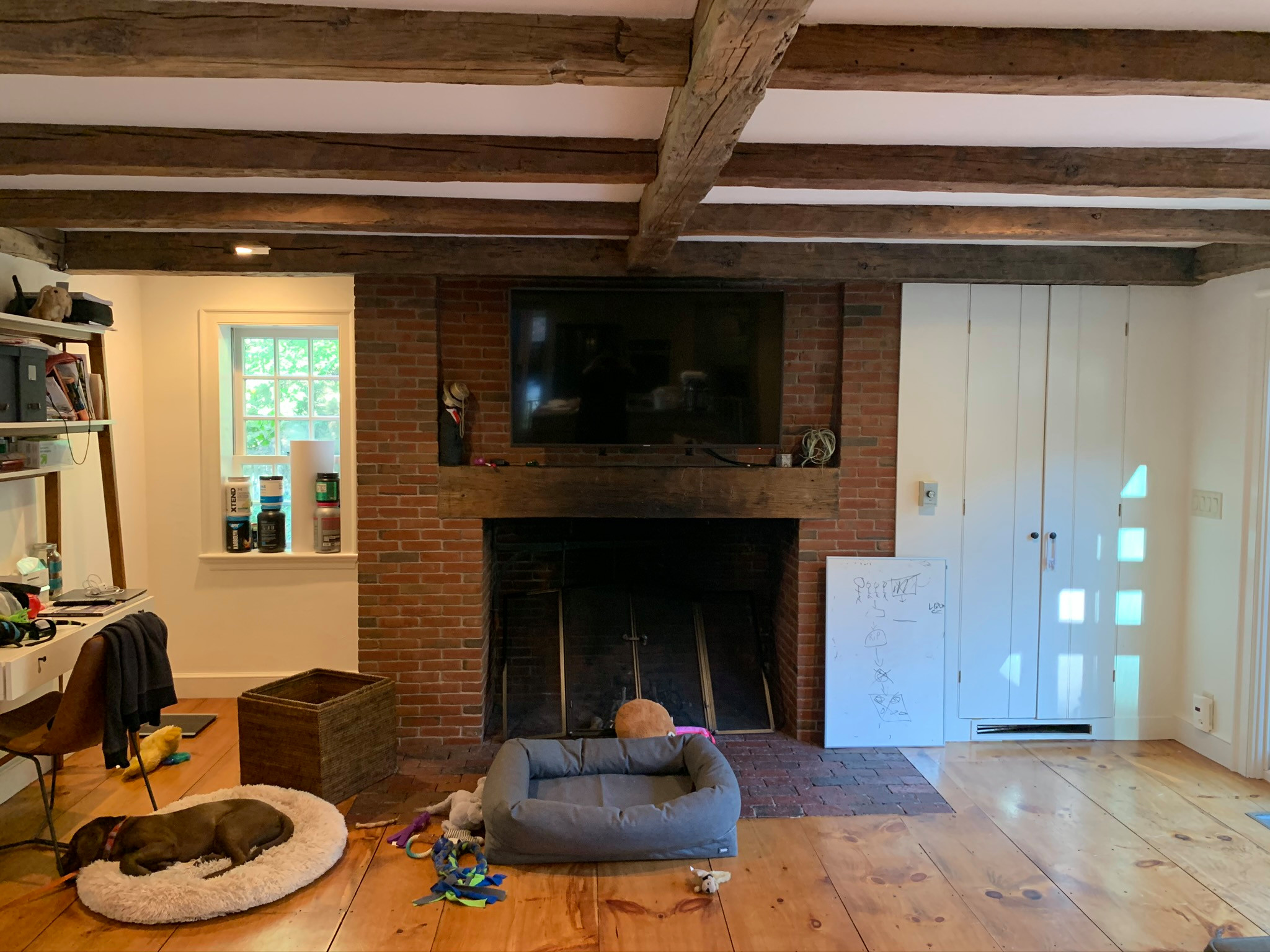 Before: A red brick wood-burning fireplace contributed to the original family room’s dark and heavy look. The rickety closet to its right was “hideous” and had to go, Swartz says.