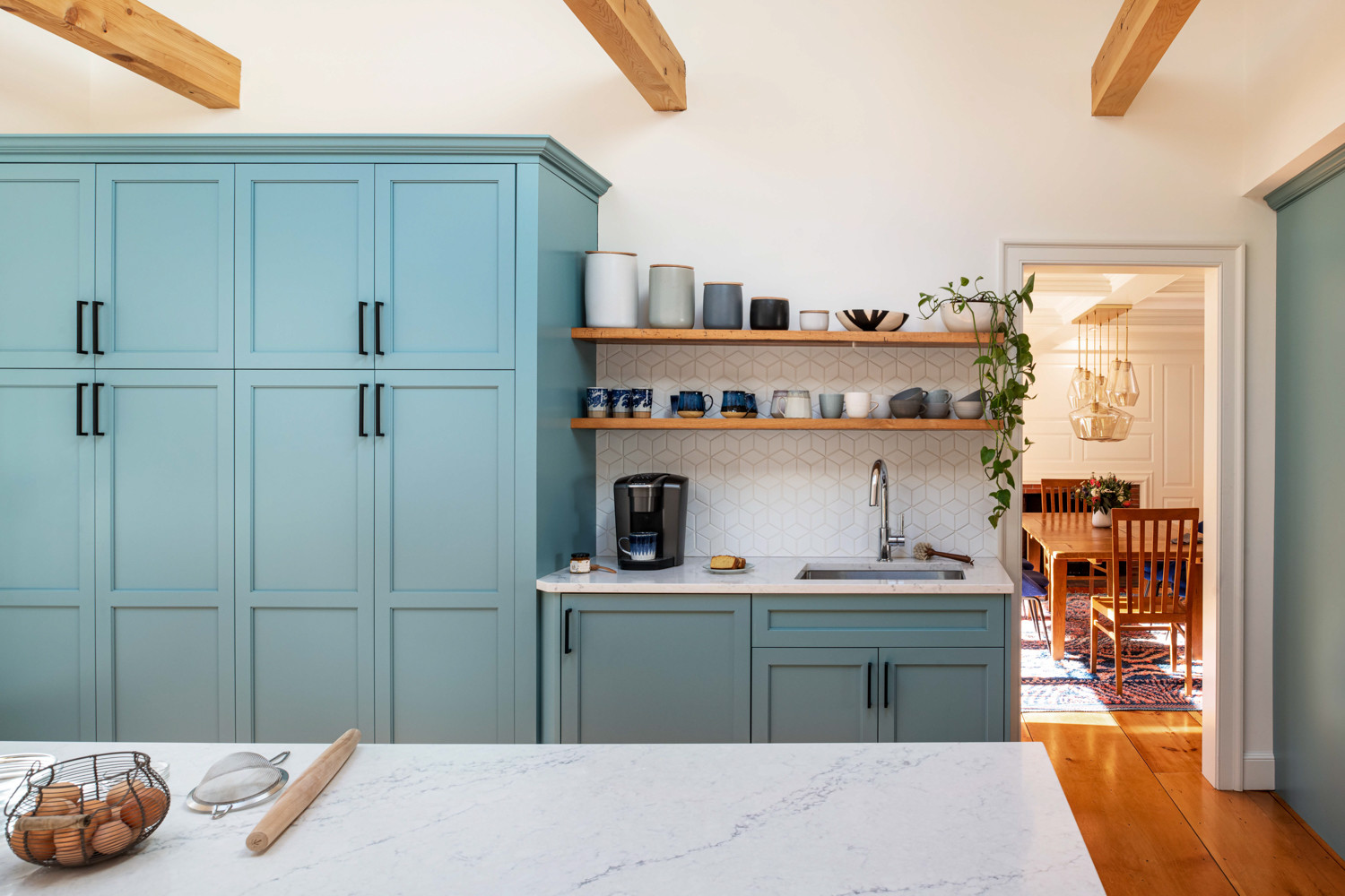 Paint colors: Williamsburg Wythe Blue (cabinets) and Simply White (walls), Benjamin Moore; quartz countertop: Karis, Viatera; matte black square bar pulls: Top Knobs; tile: Escher in Calcite, Fireclay Tile