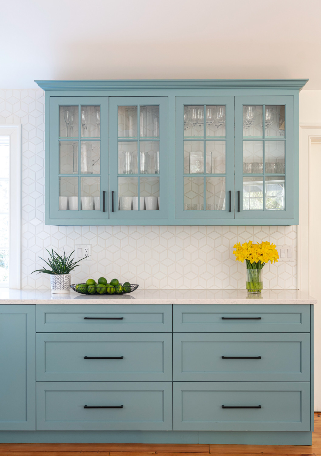 The run of cabinets ends with this cabinet, which has a backless upper that allows the geometric backsplash tile to show through. “It’s the frosting on the cake,” Swartz says.
