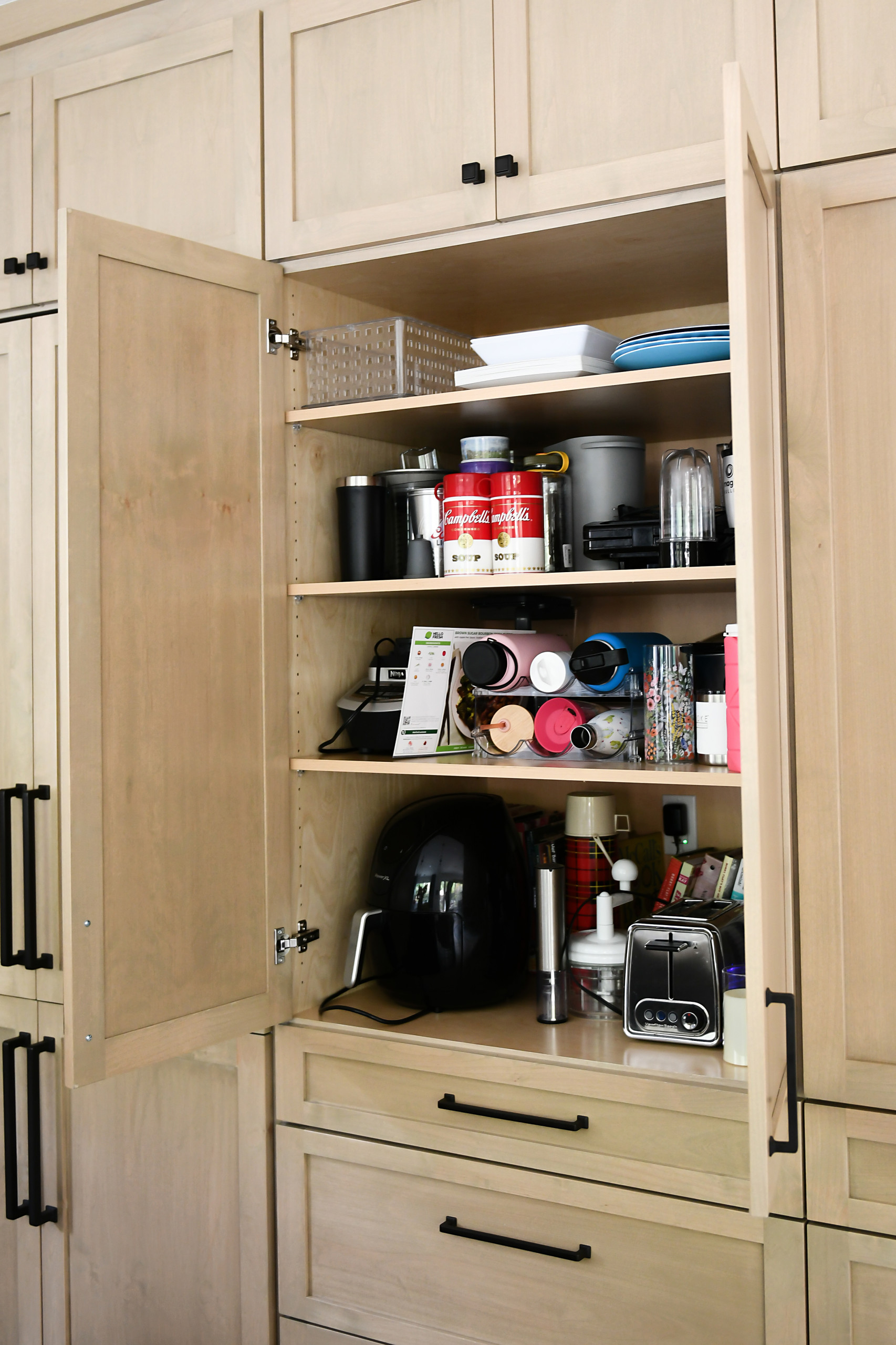 This pantry cabinet holds the couple’s coffee maker, coffee supplies and other small appliances. Drawers below hold flatware, place mats and breakfast items.