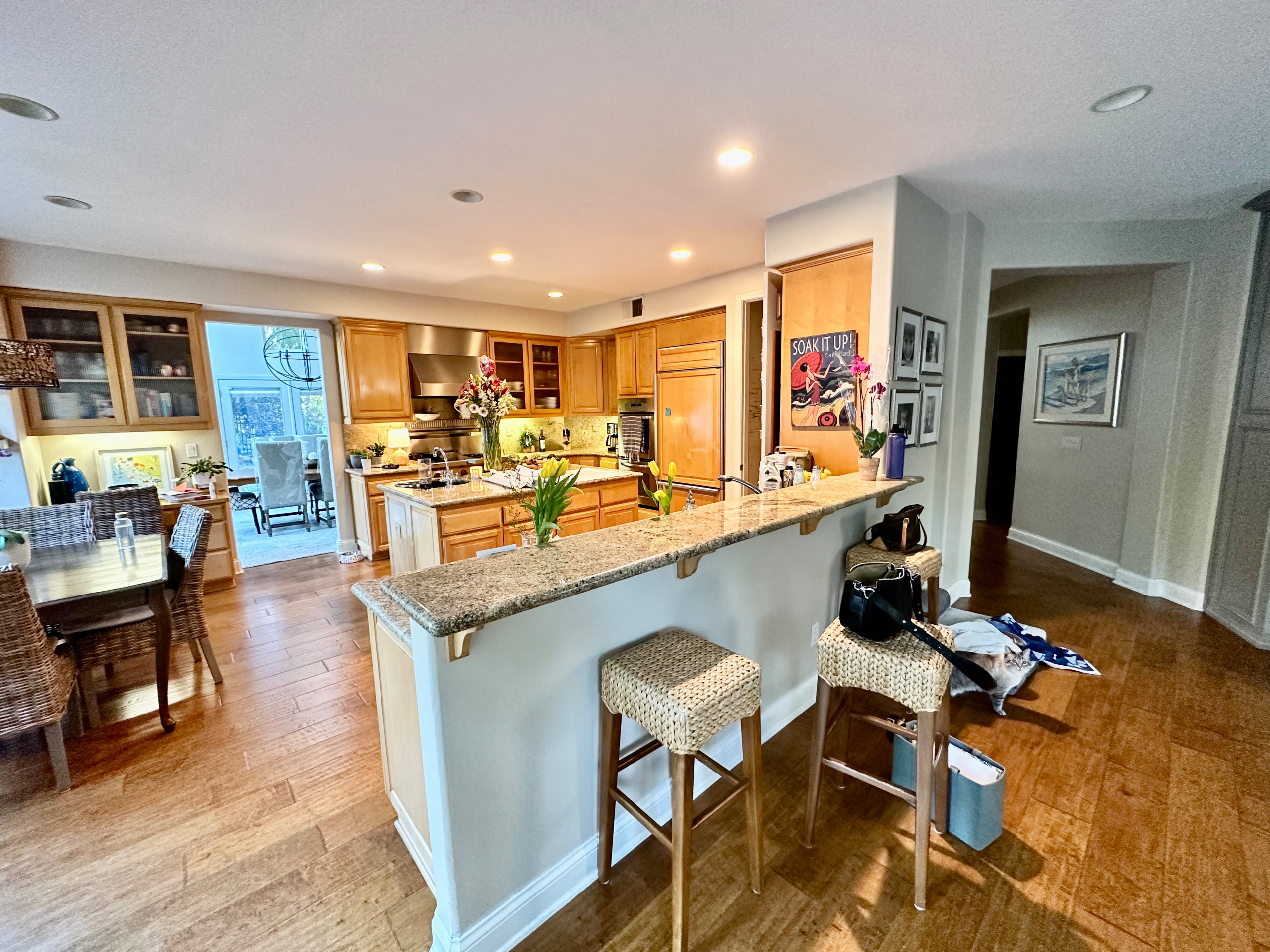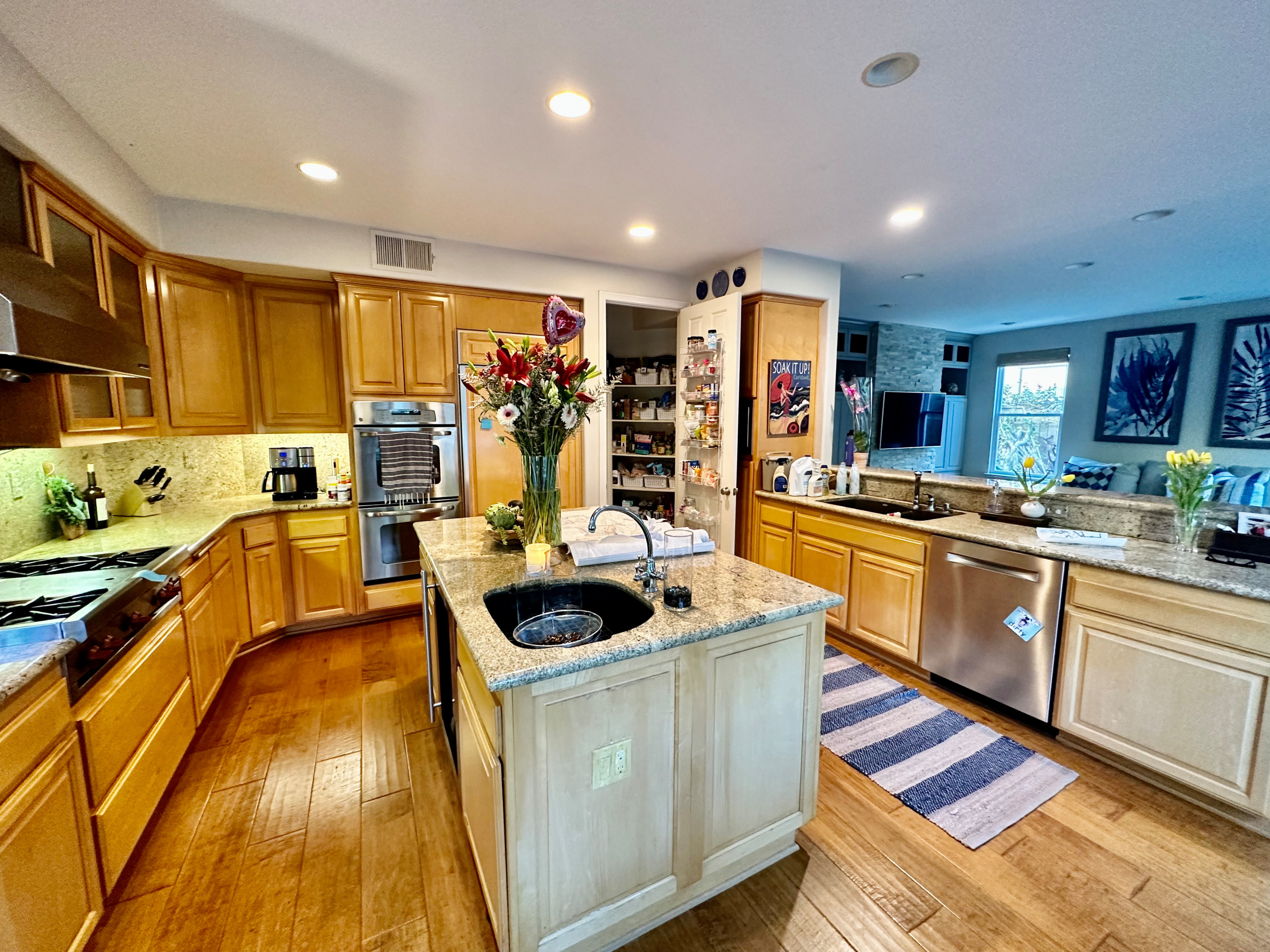 The hardworking wall on the right includes wall ovens, a paneled 42-inch built-in French door fridge and tons of pantry cabinet and drawer storage. The countertops are jumbo quartz slabs.