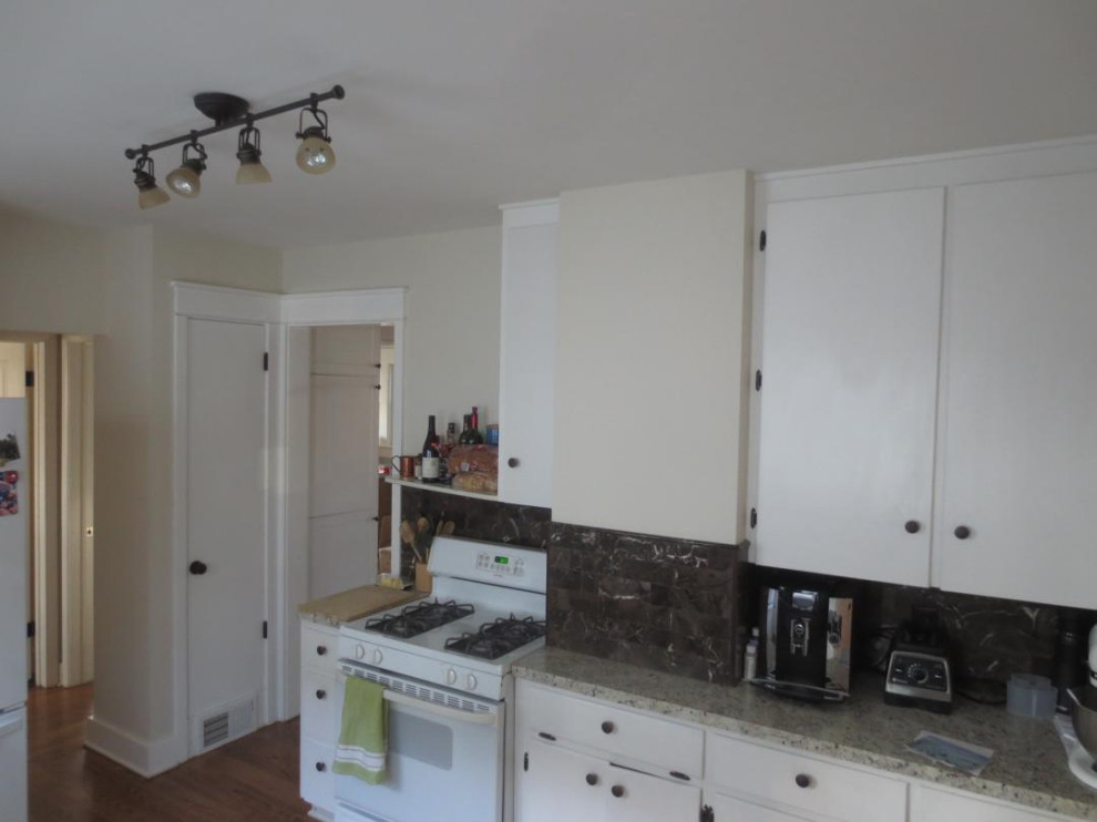 Before: This photo shows the kitchen side of the wall that separated the space from the dining room. The range sat dangerously close to the opening between the two rooms.
