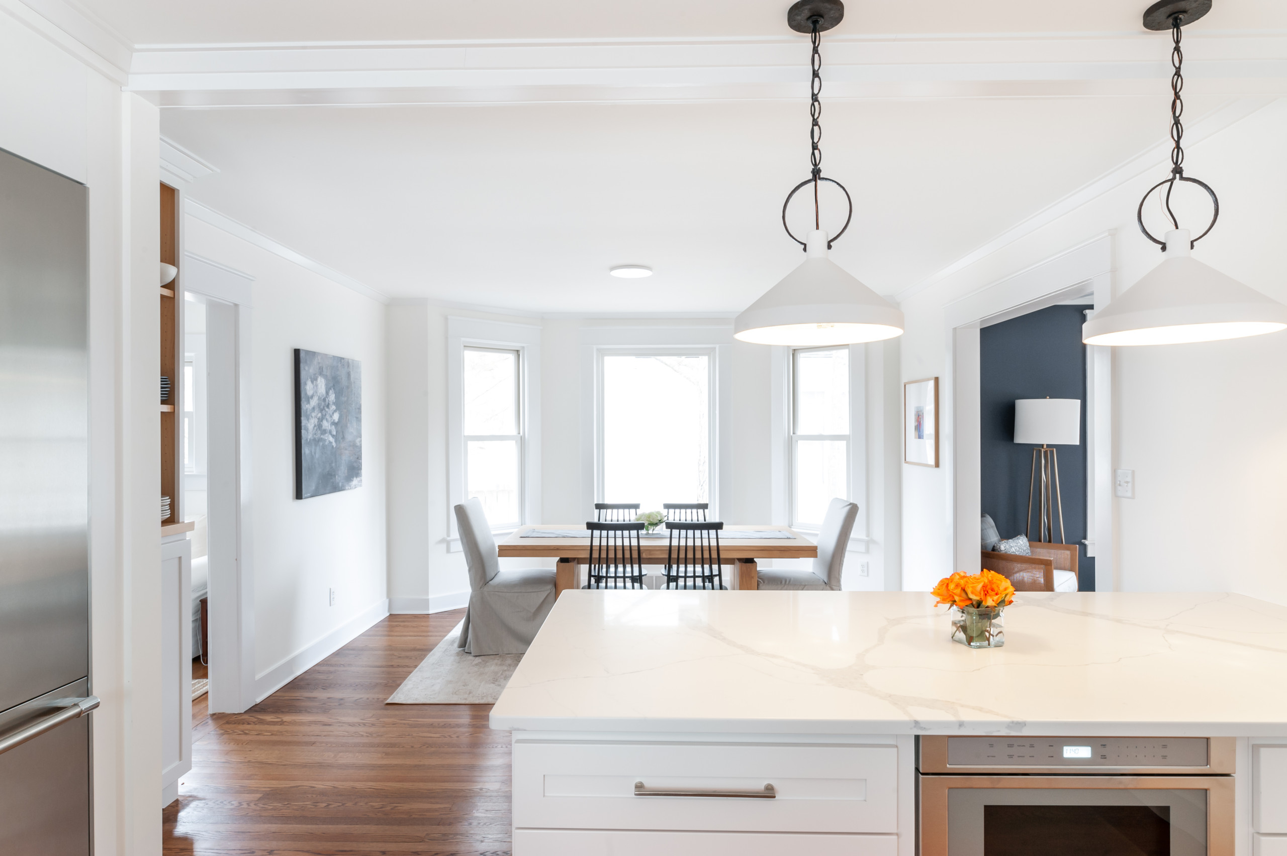 After: With the wall removed and the peninsula in its place, the kitchen now enjoys an open connection to the dining area. “By opening that up, it allowed all that natural light to go between the spaces,” Amrhein says.