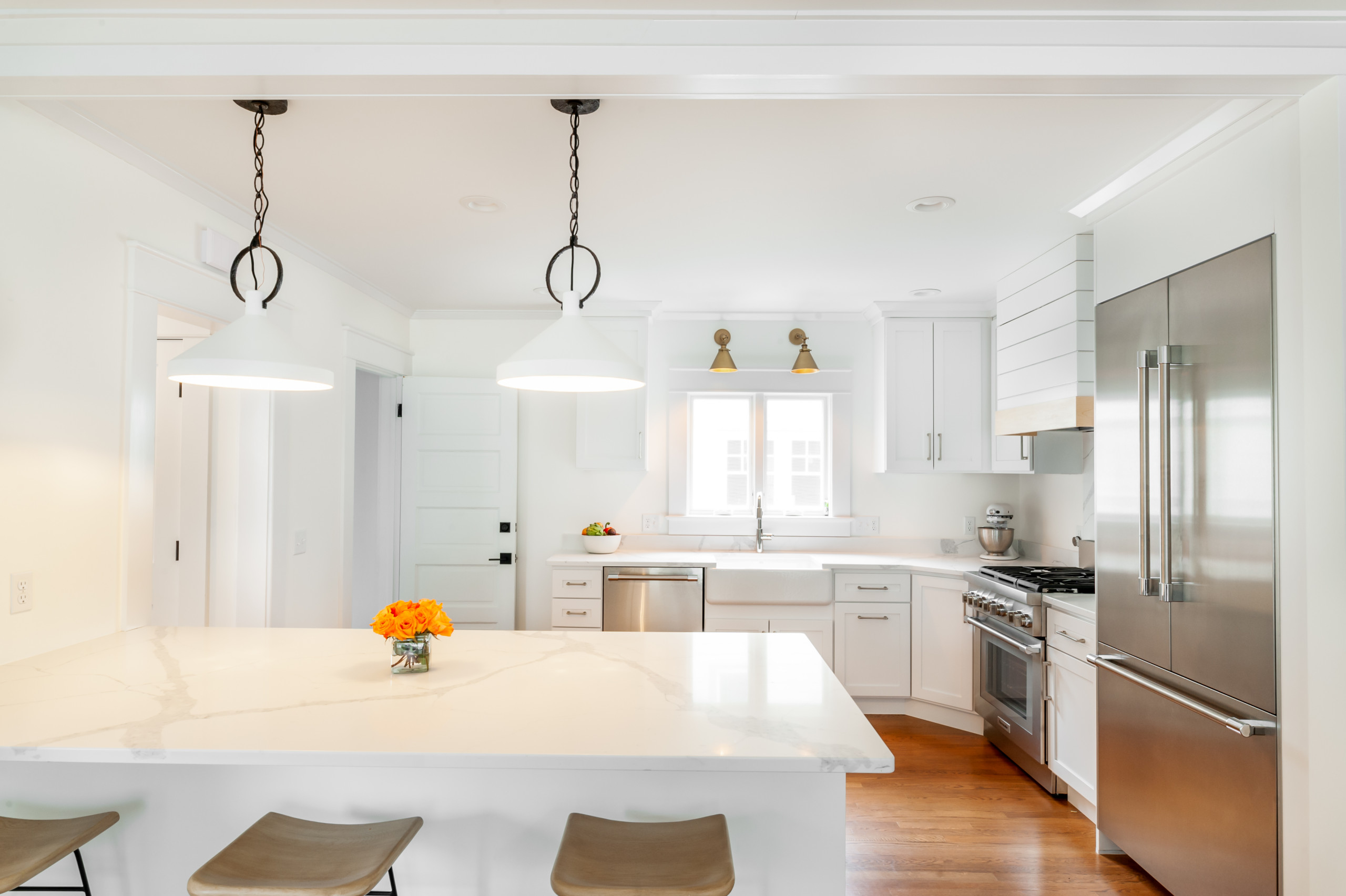 The pendants join dimmable recessed LED ceiling lights and a pair of burnished brass sconces over the sink for a layered lighting scheme. The brass sconces, stainless steel appliances, polished nickel faucet, white bronze cabinet hardware and rusted iron finish on the pendants create a mixed-metals look.