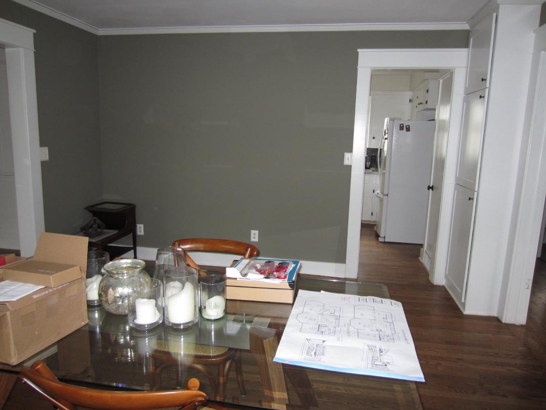 Before: The wall shown here separated the dining room, in the foreground, from the kitchen. The aging white fridge stuck out into the kitchen. And in addition to the slim doorway seen here, there was a door to the basement staircase, a doorway to the home’s front entry, a doorway to a hallway and a door to a broom closet, all of which chopped up the cabinet and countertop arrangement.