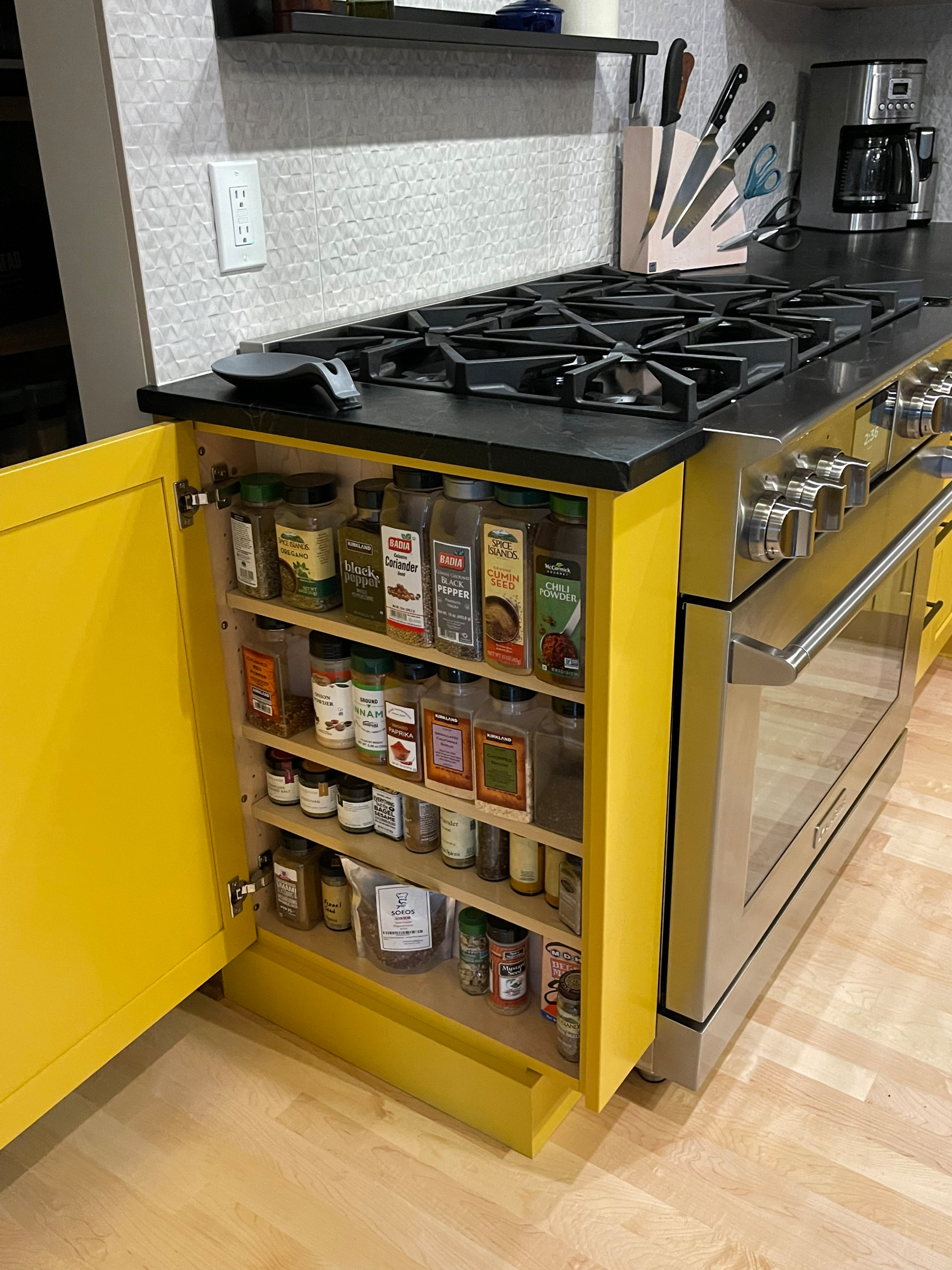 Langreck designed this shallow spice cabinet on the side of the range. “By accessing it from the side, it made the spices more visible and accessible than something that pulls out from the front,” she says.